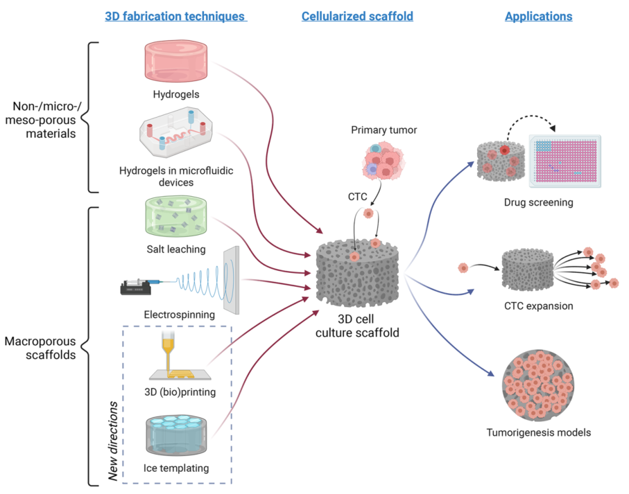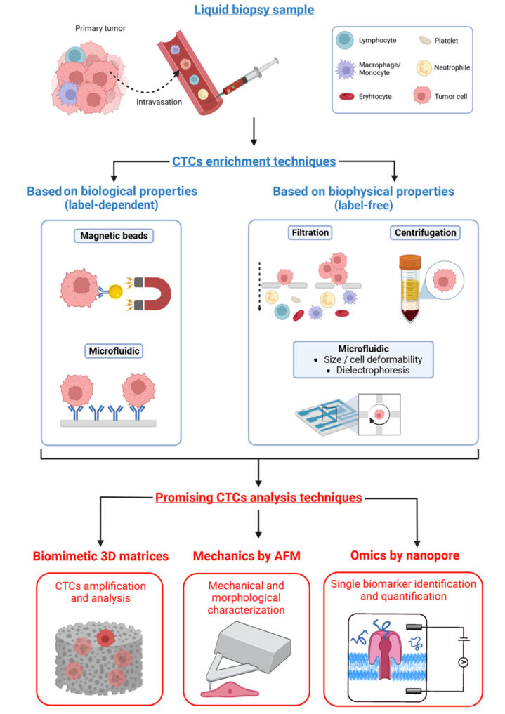 文章背景 循环中有肿瘤分离细胞(CTCs)的原发肿瘤、癌症或远处的肿瘤细胞,并进入患者的血流或淋巴系统。在外渗并在暴露于循环系统的压力下存活后,它们能够到达远处的器官。液体活检是一种微创采样方法,可用于癌症检测、预后、阐明复杂的化疗耐药机制和患者治疗管理,可以采取多种形式,包括但不限于尿液、脑脊液(CSF)和外周血样本。过去20年间,外周血样本在CTC富集/分离、检测和分选方面取得的技术进步引起了肿瘤科学界和肿瘤内科界越来越多的关注。虽然大量临床试验已经证明了CTC与预后的相关性,但其在诊断和治疗中的效用仍有待阐明。 文章内容 CTC是肿瘤诊断、预后和预测复发的生物标志物的有趣来源,但尽管在肿瘤生物学研究中对其进行了广泛研究,但其诊断效用尚未得到证实和验证。它们在人体生物体液中的稀缺阻碍了识别可能促进转移性播散的危险CTC亚群。在这一观点中,作者讨论了可能用于鉴定这些转移细胞的有前景的技术。首先描述了分离患者来源的CTC的方法,然后在扩增和分析中使用3D仿生基质,然后描述了在单细胞和单分子水平进一步分析CTC的方法。最后,讨论了未来如何结合使用原子力显微镜等技术来阐明机械和形态性质,以及使用基于纳米孔的检测来识别分子生物标志物,从而为患者和他们的医疗保健提供者提供更准确的诊断。 目前CTC富集和分选的方法,及有前景的分析技术 液体活检采集后,CTC富集主要依赖于生物物理学(无标记)或生物学(依赖标记)特性。依赖标记的技术通常涉及基于正或负亲和力的捕获,可以在试管(RosetteSep)或微流控通道(CellSearch或CTCChip)中进行。目前一些无标记技术是基于微过滤(ISET)和微流控设备(Labyrinth chip, Parsortix)的尺寸和变形性,或基于密度的梯度离心(Ficoll-Paque)或双向电泳(DEPArray)。一旦恢复,ctc可以使用仿生3D基质、原子力显微镜(AFM)和纳米孔技术进行扩增和分析。 含CTCs的三维细胞培养支架的制备策略及其相关应用 非细胞毒性水凝胶的日益增加在3D细胞培养新材料的开发和使用中发挥了核心作用。能够定制水凝胶成分、几何形状和大孔隙度的材料制造策略的兴起,为特定细胞类型构建相关环境开辟了令人兴奋的新途径。将CTC整合到这些材料中提供了解决药物筛选、CTC扩展或细化肿瘤发生模型等应用的可能性。虚线内是3D(生物)打印和冰模板,这两种技术有望在未来ctc的3D细胞培养支架的开发中发挥核心作用。 用于三维癌细胞培养的湿法和基于支架的方法例子 (a)BrCa患者ctc形成的球体荧光图像,CD44(干细胞标志物,上图)和波形蛋白(间质标志物,下图)均为阳性。比例尺100 μm。(b)来自PDAC患者的ctc衍生类器官的共聚焦图像;泛ck,绿色/DAPI,蓝色。刻度杆为10 μm。(c)第14天,在盐浸PCL支架(黄色箭头)中培养的mBRCA患者样本的红细胞(RBC)去除有核细胞扫描电子显微镜(SEM)图像。细胞间的接触由红色箭头表示。比例尺100 μm。(d)培养第3天,ha修饰PLGA NFs的相位衬度图像与加标HeLa细胞的荧光图像叠加在NFs上。 AFM原理及不同样品性质的提取 a, c. AFM原理:一端有尖端(a)或细胞(c)的悬臂与样品相互作用。悬臂的偏转由激光束监测,激光束从悬臂反射并指向光电二极管。尖端与样品的相互作用导至悬臂梁偏转和随后的激光束偏转,这被光电二极管记录下来,提供电信号作为输出。压电元件精确地控制悬臂梁相对于样品的运动。b, d.分析尖端-细胞(b)和细胞-细胞(d)相互作用的合力曲线,以提取样品的多种属性。逼近力曲线提供了样品形态(b)和力学性能(b, d)的信息。根据力曲线计算得到的高分辨率的形貌和弹性模量图(15 × 15 μm2)显示了(b)。撤回力曲线包含了悬臂与样品之间的相互作用(b, d)和膜系形成(d)的信息。直接计算系绳的数量,分离长度,和破裂力是可能的,从力曲线。 微流控捕获的局部和转移癌患者完整前列腺CTCs的AFM分析 a.显微图显示AFM尖端位于epcam染色的CTC中心上方,这样力的测量可以用于后续的纳米力学表征。比例尺30 μm。b. AFM尖端与CTC相互作用的代表性力曲线,其中黑色箭头表示尖端靠近细胞表面和从细胞表面回缩的方向。在初始尖端-胞体表面接触后,由于施加的恒定载荷,胞体会经历一定量的表面变形D。当尖端从细胞表面缩回时,由于与AFM尖端表面的相互作用,细胞会经历许多粘附力F(缩回过程中的峰值为1 - 7),直到尖端完全脱离。在这个过程中,脱离的工作“WD”(零力线以下的灰色阴影区域)表示完全脱离细胞表面所需的工作量。c, d.测量局限性(n = 3)和转移性(n = 2)肿瘤来源的ctc的所有杨氏模量E、变形量d、粘附力F和脱离WD的功的分布直方图。实黑线是拟合对数正态或高斯概率密度函数的数据。 纳米孔用于ctc表征的应用 从原发肿瘤中分离的ctc可以恢复并在单细胞水平进行分析。提取的CTC生物标志物包括(1)蛋白质/肽,(2)微rnas和(3)DNA,然后可以使用纳米孔技术分析。在纳米孔实验中,一个含有纳米大小孔的绝缘膜被放置在两个充满电解质的隔间之间。当电压跨膜施加时,离子电流通过纳米孔(蓝色的孔)。通过孔的运输或相互作用引起电流的减少,由于离子运输的部分阻断(红色孔)。阻断电流的深度和持续时间取决于分子的化学性质、构象、大小和序列,但也取决于孔的几何形状。单生物分子纳米孔分析的应用包括潜在生物标志物检测、定量、测序和酶促反应测定。CTC检测已经通过纳米