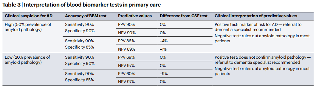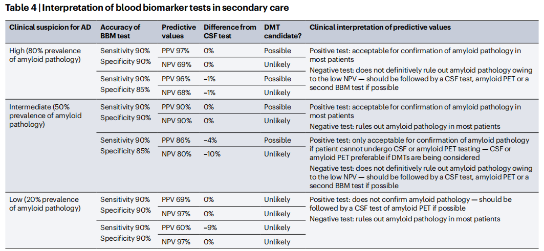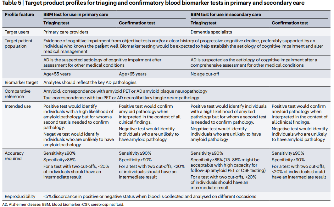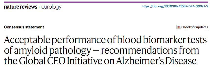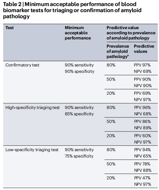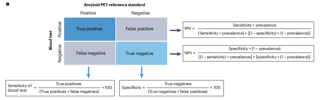 自2021年以来,淀粉样蛋白-β(Aβ)抗体aducanumab和lecanemab已获得FDA批准,donanemab正在寻求FDA批准。这些新疗法适用于早期症状性阿尔茨海默病,迫切需要对轻度认知障碍和轻度痴呆患者进行准确的、基于生物标志物的阿尔茨海默病诊断。确定淀粉样蛋白病理存在的临床试验已有十多年的历史,包括淀粉样蛋白PET和脑脊液(CSF)试验。在过去的5年中,多种血液生物标志物(BBM)检测被开发出来,并广泛用于阿尔茨海默病的研究和临床试验。与淀粉样蛋白PET和脑脊液试验相比,BBM试验更容易被接受和获得,并且可以迅速扩大规模以满足日益增长的生物标志物检测需求。 虽然目前临床上有多种BBM测试,但这些测试的性能差异很大。在杂志Nature reviews neurology上发表了一篇本共识声明,阿尔茨海默病全球CEO initiative(CEOi)BBM工作组提出了关于临床使用BBM测试的最低可接受性能的建议。这些建议旨在为患者、提供者和检测开发人员提供临床使用的BBM检测的最低标准,并描述这些标准的基本原理。 图片来源:Nature reviews neurology 1 AD生物标志物检测的 临床应用 ● 目前,淀粉样蛋白病理通常是临床实践中唯一评估AD病理的类型,通常通过淀粉样蛋白PET或脑脊液生物标志物检测。与之相比,BBM试验具有独特的优势,也更容易地扩大规模。最有希望的BBM测量淀粉样蛋白状态的方法包括在不同位点磷酸化的Aβ42/Aβ40和磷酸化tau,包括p-tau181, p-tau217和p-tau231。已开发的不同BBM测试具有广泛不同的性能。即使是测量相同分析物的BBM测试,也会因分析方法、抗体或其他试剂或特定分析平台而在性能上存在重大差异。血浆Aβ42/ Aβ40比值在淀粉样蛋白PET状态分类中的AUC为0.70-0.85,基于质谱的分析通常比免疫分析更准确。各种磷酸化tau蛋白的检测在预测淀粉样蛋白状态方面表现更好。血浆p-tau217水平或p-tau217与非磷酸化tau比值的AUC为0.92-0.98。其性能的广泛差异提出了一个问题,即在临床实践中使用的测试必须有多准确。 2 分析验证和参考标准 ● 评估BBM测试的第一步是分析验证,以评估其可靠测量分析物的能力。诸如测量的可变性、测试的灵敏度、测量值的范围和潜在干扰物质的影响等因素都要进行检查。分析前样品的处理和处理会影响生物标志物值,因此有必要制定一致的血液采集和处理方案。 任何诊断测试的关键考虑因素是与之比较的参考标准。虽然淀粉样蛋白PET读数并不是淀粉样蛋白状态的完美参考标准,然而在淀粉样PET已被用作目前FDA参考标准的基础上,BBM工作组也将淀粉样PET作为BBM检测性能分析的参考标准。 3 测定灵敏度和特异性 ● BBM试验的敏感性定义为淀粉样PET阳性个体与BBM试验阳性个体的百分比。特异性定义为淀粉样蛋白PET阴性个体与BBM阴性个体的百分比(如下图)。BBM工作组考虑使用两个截止值来定义三类结果:阳性、中间状态和阴性,但如果单个截止点产生可接受的准确性,则不需要这种方法。BBM工作组建议,在典型临床人群中,BBM测试的中间值不应超过15-20%。 如果BBM测试结果为中间状态,后续因患者和护理环境而异。如果个体是抗淀粉样蛋白治疗的潜在候选者,则淀粉样蛋白PET或CSF测试将是合适的。然而,如果确定淀粉样蛋白状态不太可能影响患者的短期治疗,或者淀粉样蛋白PET或CSF测试不可用,则晚些时候(例如1年后)重复BBM测试可能是合理的。 4 确定BBM测试的预测值 ● BBM测试的临床效用更好地反映在BBM测试阳性的个体是淀粉样蛋白PET阳性的可能性-(阳性预测值(PPV) )以及BBM测试阴性的个体是淀粉样蛋白PET阴性的可能性(阴性预测值(NPV))(如下图)。PPV和NPV受受测人群中淀粉样蛋白病理患病率的强烈影响。 当考虑在二级医疗机构中使用BBM测试时,BBM工作组根据关键研究考虑了淀粉样蛋白病理患病率的三个不同水平:80%、50%和20%。当考虑在初级保健中使用BBM测试时,考虑两种患病率:50%,20%。S.E.S.及其同事基于研究队列开发了一个基于年龄和迷你精神状态检查来估计淀粉样变性患病率的计算器。诊断公司可以结合BBM测试结果提供类似的计算器,以帮助供应商解释结果。临床医生应该结合患者完整的诊断检查调整患者患病的可能性。 确定淀粉样蛋白病理的血液生物标志物检测的性能。 图片来源:Nature reviews neurology 5 CSF测试作为基准 ● FDA批准的脑脊液淀粉样蛋白病理学测试是BBM测试性能的重要基准。FDA批准了Fujirebio Lumipulse G CSF β-淀粉样蛋白比率测试。这项研究使用了两个cut-off值,当具有“阳性”和“可能阳性”结果的个体都被认为是阳性时,CSF测试敏感性为92%,特异性为84%,当排除可能阳性时,敏感性为92%,特异性为93% 。 罗氏Elecsys测试,测量p-tau181/Aβ42或t-tau/Aβ42的比率,并使用单一cut-off值。在来自瑞典BioFINDER研究训练队列中,p-tau181/ Aβ42测试的敏感性为91%,特异性为89%。在第二个验证队列中,敏感性为88%,特异性为93%。t-tau/ Aβ42测试结果类似。 这些经FDA批准的CSF测试为AD生物标志物测试的性能提供了基准,并表明灵敏度和特异性约为90%,与淀粉样蛋白PET基本相当。 6 使用环境 ● BBM测试有两个主要用途:分诊和确认淀粉样蛋白病理。对于分诊测试,主要用于识别不太可能有淀粉样蛋白病理的个体。这些测试最适合于测试前淀粉样蛋白阳性概率≤50%的患者。当淀粉样蛋白阳性的预测概率>50%时,NPV相对较低,BBM阴性结果不能排除淀粉样蛋白病理,因此帮助不大(见下表)。 对于确