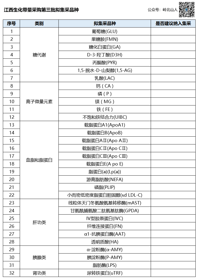 整理:岭北山人 各有关省(自治区、直辖市)医疗保障局: 为深入推进药品医用耗材集中带量采购,充分发挥带量采购规模效应,根据《国家医疗保障局办公室关于加强区域协同做好2024年医药集中采购提质扩面的通知》(医保办发(202418号)有关精神,我省拟牵头开展糖代谢等生化类检测试剂省际联盟集中带量采购。现诚邀贵省(区、市)与我省共同组成省际采购联盟。如有意向,请于7月16日17时前函复我局,请填写省际联盟集采联络人员信息表,并对拟集采品种提出意见建议。 根据表格,此次明确了糖代谢7项、离子微量元素5项、血脂和脂蛋白10项、肝功能6项、胰腺类3项、肾功能1项。 建议纳入集采的品种在对应表格中打√,不建议纳入集采则打x。 如有表格中未提及的建议纳入集采的品种,可在表格后进行添加。 不同于第一次调研结果,此次明确的6个类别的32个项目,不仅涵盖糖代谢和离子微量元素,同时将肝功、肾功、血脂类未纳入的部分重新纳入。 其中糖代谢去除了最大体量的糖化血红蛋白,还有大家关注的脂联素。这两个项目没有纳入。 |