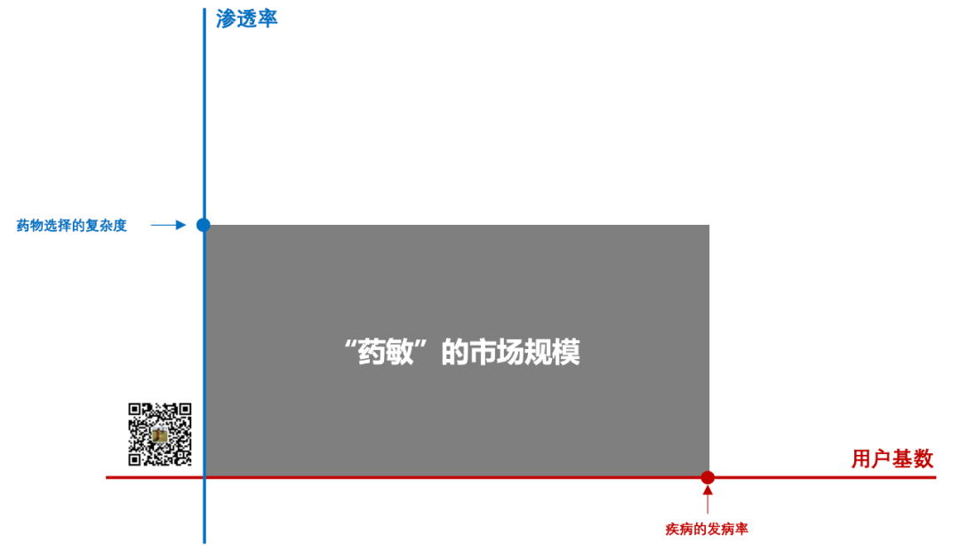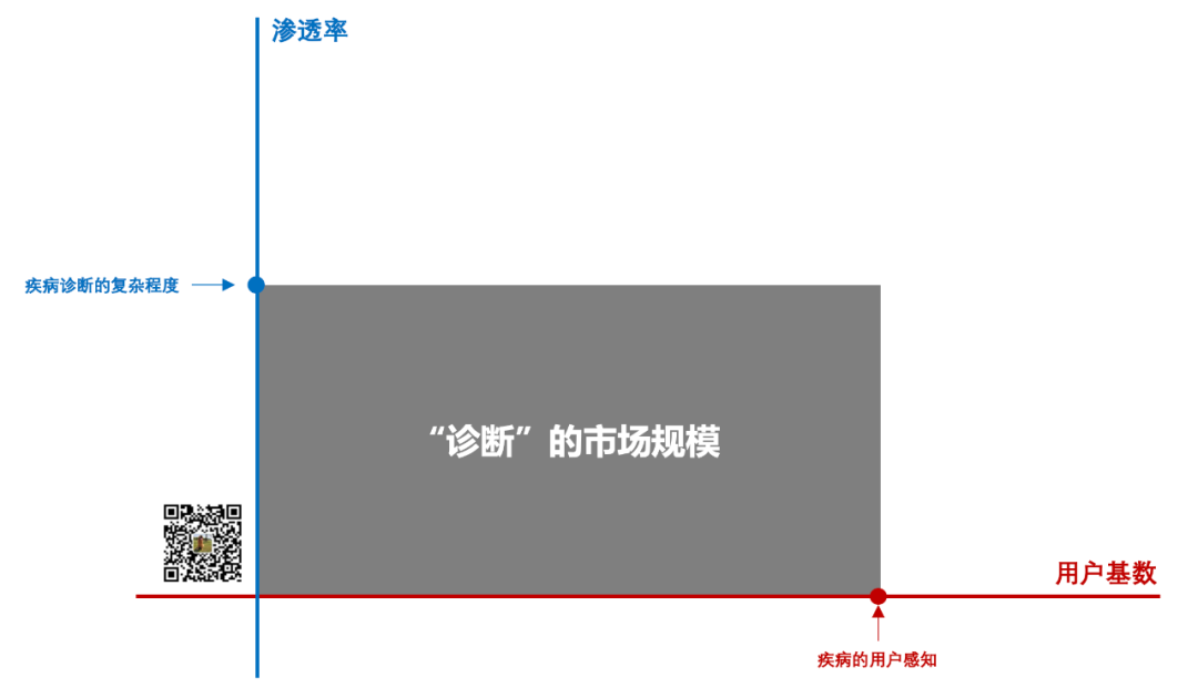其价值在于去“提示”某种疾病,比如早筛/辅助诊断,或者跨界来看t/mNGS也是这一类。 这一类产品的检测市场规模是下面这个图: 其中横轴的“用户基数”与疾病的用户感知密切相关,纵轴的“渗透率”与疾病诊断的复杂程度紧密挂钩。