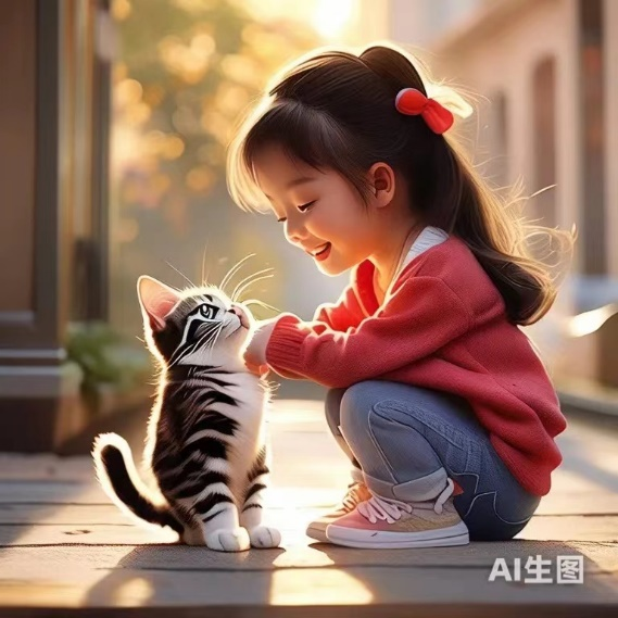 随便选择一个AI工具,让它帮你生成一幅阳光午后,一个小女孩在路边遇到一只小猫咪,迪士尼风格的图片,很快就可以完成,如下图所示。