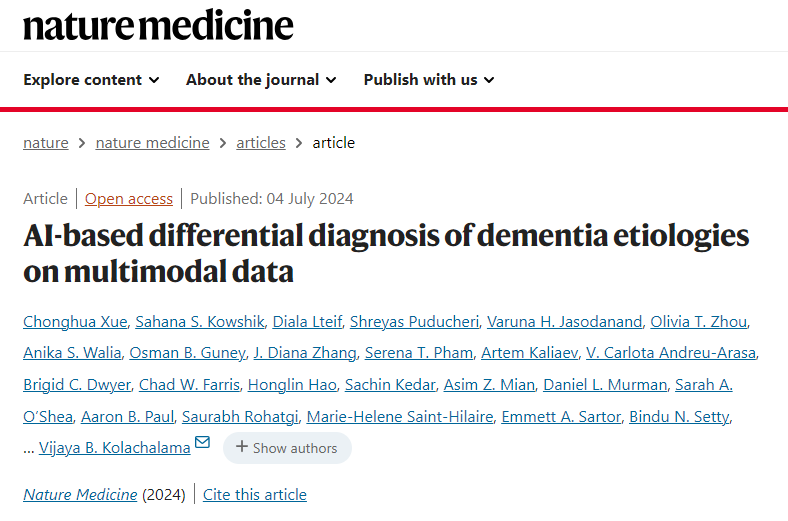 Xue C, Kowshik SS, Lteif D, Puducheri S, Jasodanand VH, Zhou OT, Walia AS, Guney OB, Zhang JD, Pham ST, Kaliaev A, Andreu-Arasa VC, Dwyer BC, Farris CW, Hao H, Kedar S, Mian AZ, Murman DL, O'Shea SA, Paul AB, Rohatgi S, Saint-Hilaire MH, Sartor EA, Setty BN, Small JE, Swaminathan A, Taraschenko O, Yuan J, Zhou Y, Zhu S, Karjadi C, Alvin Ang TF, Bargal SA, Plummer BA, Poston KL, Ahangaran M, Au R, Kolachalama VB. AI-based differential diagnosis of dementia etiologies on multimodal data. Nat Med. 2024 Jul 4. doi: 10.1038/s41591-024-03118-z. Epub ahead of print. PMID: 38965435.