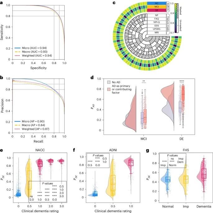 处理缺失数据的表现(c):示意图显示了在存在缺失数据的情况下模型的不同表现。内层同心圆表示在特定测试信息被省略(masked)或包含(unmasked)时的不同情境。三个外层同心圆表示模型在NC、MCI和DE标签上的AUROC表现。即使在MRI、统一帕金森病评分量表、老年抑郁量表、神经精神清单问卷、功能活动问卷等数据缺失的情况下,模型仍然能够产生可靠的评分。