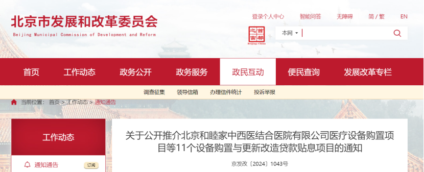 | 近两周内,医疗设备更新项目密集推进,涉北京、广东、吉林、福建… 01 北京八家医院,设备更新项目通过联审 近日,北京发改委发布《关于公开推介北京和睦家中西医结合医院有限公司医疗设备购置项目等11个设备购置与更新改造贷款贴息项目的通知》。