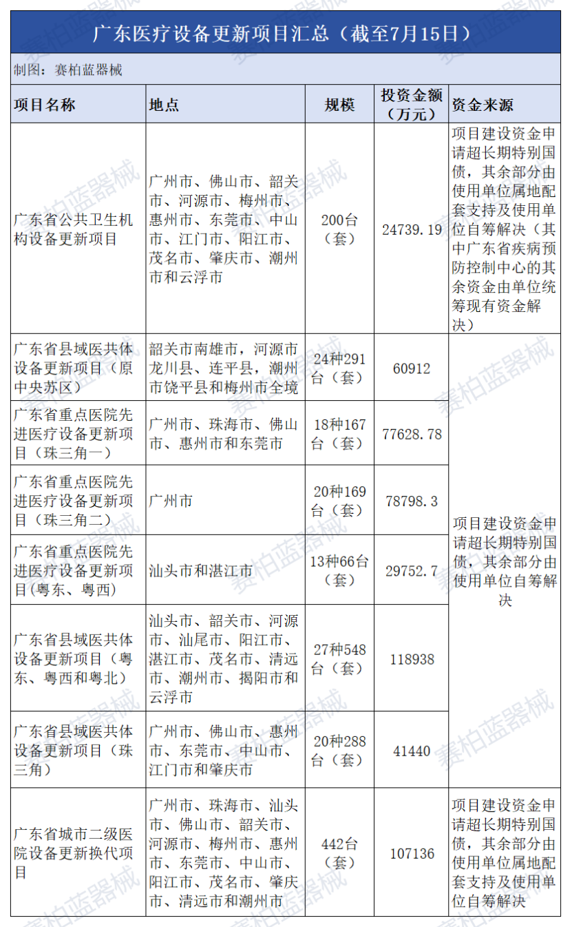 据悉,北京2024年首批项目征集工作已完成,共征集项目193个,目前已陆续开展项目联审。将坚持“成熟一批、联审一批、推介一批”要求,滚动开展后续通过联审项目推介工作。02 除北京外,7月以来,广东、吉林、福建等地医疗设备更新项目也传来新消息。7月2日,广东发改委更新一批医疗设备更新项目可行性研究报告的复函。广东此轮医疗设备更新项目总投资超53亿元,涉及八大项目。