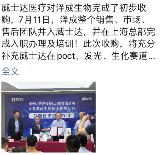 近日,在朋友圈看到一则消息:上海威士达医疗对苏州泽成生物完成了初步收购。 7月11日,泽成生物整个销售、市场、售后团队并入威士达,并在上海总部完成入职办理及培训!此次收购,将充分补充威士达在POCT、发光、生化赛道的布局。 医业观察编辑小K第一时间联系泽成生物内部人士,对方表示双方确实在业务层面达成战略合作,除个别省份,其他的都代理给威士达,包括生化,发光及POCT发光产品,这些省市销售,售后工程师及市场团队都加入威士达,同时双方还有一些委托开发的业务合作。但是此次战略合作不涉及到公司股权层面。 上海威士达是谁? 威士达是香港上市公司华检医疗控股(IVD Medical Holding)的集团公司。威士达与希森美康于1997年签订了经销商合同,负责希森美康凝血产品和希森美康经营的西门子凝血产品在中国的销售/客服及代理商管理。 2023年11月,希森美康出手,直接增资威士达,项目完成后,希森美康将持有5%的威士达股权。 江苏泽成是谁? 江苏泽成生物技术有限公司成立于2011年,是一家以全自动化学发光产品为主的体外诊断企业。泽成生物坚持不断创新,专注化学发光试剂,拥有管式磁微粒化学发光免疫分析智能诊断系统相关知识产权,获得多项发明专利,目前拥有180多个化学发光产品注册证,产品备受行业认可。除自营业务外,泽成生物积极开展CDMO模式的探索,目前已经和国内外多家知名体外诊断企业达成合作,提供化学发光原料、试剂盒及检测系统解决方案。 威士达对泽成生物的收购,感觉更像是威士达,希森美康,泽成三方的优势互补,强强联合,抱团取暖。希森美康将其严格的质量管理体系输入泽成生物以缜密的生产规范,严格的质量检验标准提升泽成生物的产品质量,希森美康可提升产品的完善度,实现全球增长战略的进一步推进。有了泽成的并入,威士达在POCT,发光,生化赛道有更多布局,进一步扩大合作优势。 希森美康是谁? 希森美康公司是一家跨国企业,是全球知名的临床检验综合方案提供商。公司创建于1968 年,总部设在日本神户市,在中国、欧洲、美洲、亚太地区等国家设有70余个分支机构,产品遍布全球 190 多个国家。 2023年,希森美康多次公布和江苏泽成的战略合作关系。 第一次是2023年3月,希森美康与泽成生物签署战略合作协议,携手推进高敏免疫化学发光检测试剂国产化; 第二次是2023年6月,希森美康与泽成生物推进全面深度合作,双方将进一步扩大技术和业务合作,探索多元化协作模式,携手实现多区域共赢发展。 |