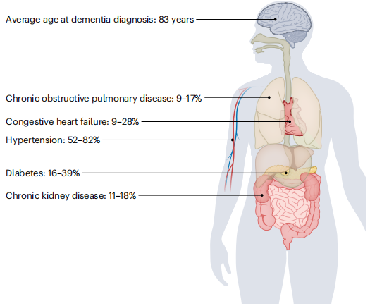在美国,诊断为痴呆的平均年龄估计为83岁,但大多数关于BBM的研究都集中在更年轻和更健康的队列上。大约60%的老年人(70岁及以上)的AD/ADRD患者患有三种或三种以上的慢性疾病(如下图),可能会影响AD的BBM水平,但不影响脑脊液或PET生物标志物。