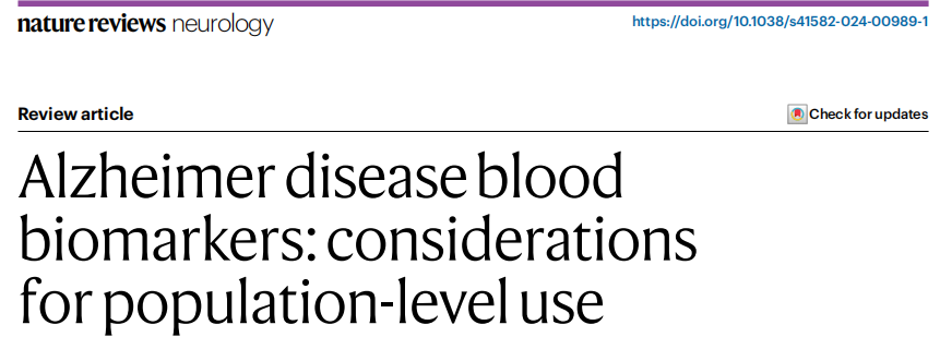 杂志Nature reviews neurology上发表了一篇题为“Alzheimer disease blood biomarkers: considerations for population-level use”的文章。在这篇综述中,作者概述了在广泛实施和解释AD BBMs时需要考虑的因素。作者首先回顾了目前生物标志物在AD中的使用,包括BBMs。作者考虑了可能影响BBM测试解释的因素,如合并症、性别和种族或民族。最后还讨论了更广泛的问题,如伦理、患者和提供者偏好、偶然发现、处理不确定的结果和在人口水平上实施BBM的不完美准确性。