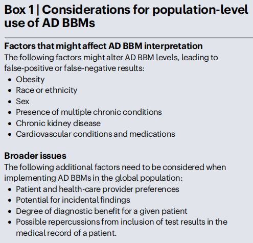 使用AD BBM进行筛查的想法引起了一些担忧。并非所有的人都想知道自己的风险,此外,认知障碍患者的BBM提供的AD病理证据可能会产生法律影响,如上文所说对保险及驾车和持枪权利的影响,并加剧病耻感。另一个重要的考虑因素是,一些人可能更喜欢直接面向消费者(to C)的测试。然而如表现不佳、难以解读结果和/或对假阳性结果的指导不足,可能会给个体造成重大痛苦。此外,许多卫生保健提供者可能缺乏解读这些测试的专门知识。