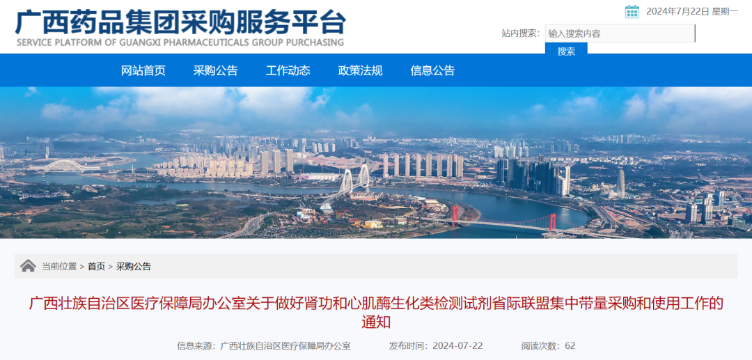 各市医疗保障局,自治区医疗保障事业管理中心、自治区医保基金监管事务中心,区直及解放军、武警部队驻桂医疗机构,药材供应机构,自治区公共资源交易中心,数字广西集团有限公司,各有关生产、配送企业:现就我区落实江西省牵头肾功和心肌酶生化类检测试剂省际联盟集中带量采购中选结果有关事项通知如下:肾功和心肌酶生化类检测试剂省际联盟集中带量采购中选结果(详见附件1)、肾功和心肌酶生化类检测试剂省际联盟集中带量采购产品供应清单(详见附件2)。全区范围内所有公立医疗卫生机构(含军队医疗机构)以及参与报量的其它各类医疗机构均应按要求优先采购、使用中选产品。鼓励社会办医疗机构采购、使用中选产品。本次采购周期自2024年8月15日起计算2年,每年一签,续签采购协议,原则上续签总量不低于上年实际采购量。请各医疗卫生机构在落地前提前按照中选价格采购备货,确保8月15日起我区患者能够以中选价格使用中选产品。(一)中选产品挂网及配送关系维护。请中选企业及时登录国家医疗保障信息平台药品和医用耗材招采管理子系统(广西)(以下简称“招采子系统”,网址:https://ybwt.ybj.gxzf.gov.cn/#/unitLogin),按照要求补充完善企业信息、提交企业产品库信息审核,中选产品发布挂网后,中选企业自主选定有配送能力、信誉度好的配送企业。各中选企业、有关配送企业在2024年7月31前完成配送关系的确认工作。(二)签订购销合同。请各医疗卫生机构于2024年8月12日前登录招采子系统,与相关中选企业和配送企业完成购销合同的签订工作。(三)优先使用中选产品。医疗机构要畅通中选品种进院渠道,协议期内优先使用带量采购中选产品,并不得在进院、库存等环节向企业收取附加费用,确保完成协议采购量;超出协议采购量的部分,医疗机构仍应优先使用中选产品,中选企业仍需按中选价格进行供应,直至采购周期届满(四)做好医保支付政策衔接。做好医保支付政策衔接。医保医疗服务项目范围内的医用耗材,集中带量采购中选产品以中选价格作为医保支付标准,医保基金按规定比例支付。非中选产品销售价格低于同类中选产品最高中选价格的,以销售价格作为医保支付标准;销售价格高于同类中选产品最高中选价格2倍(含2倍)以内的,以同类中选产品最高中选价格作为医保支付标准;销售价格高于同类中选产品最高中选价格2倍以上的,以同类中选产品最高中选价格的110%作为医保支付标准,在两年内渐进调整医保支付标准至不超过同类中选产品的最高中选价格;超出医保支付标准的费用由患者自付。(五)其他配套政策。本次中选结果在我区涉及的供应保障、货款结算、医保预付、结余留用以及管理、监测等要求,参照我区现行相关规定执行。各地要深刻认识肾功和心肌酶生化类检测试剂省际联盟集中带量采购和使用的重要意义,增强责任感、使命感,切实加强组织领导,落实好相关配套措施。各地医保部门要充分发挥牵头部门作用,加强与相关部门协调,落实部门责任;要压实采购主体责任,做好对辖区内医疗卫生机构执行中选品种使用情况的监测;同时要加强宣传工作,做好舆情监测和应对,及时回应关切,合理引导预期,努力营造改革的良好氛围,平稳推进集采结果落地实施。