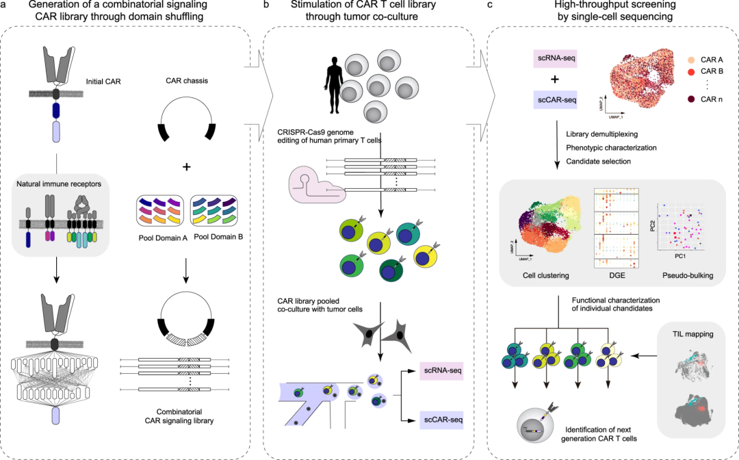 那么,我们可以如何做到呢? 其实很简单,只要我们能够获得目标CAR序列,并将其与一段 这一个小小的设计,我们便可以获得一张全新的图谱,并可以把它应用在不同的CAR-T细胞治疗的血液样本中。 当然,不同靶点的CAR-T细胞的这段CAR是不一样的,这里的序列结构信息也值得关注,不同的CAR有没有一段保守的序列,可以一起来捕获? 也有文章通过信号域改组和单细胞测序加速CAR-T细胞工程,这方法是:speedingCARs: accelerating the engineering of CAR T cells by signaling domain shuffling and single-cell sequencing 怎么样,这个scCAR-seq的想法有没有让你也想开发新的方法,用于治病救人?