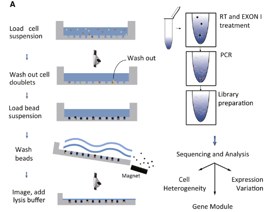 你可曾留意过“微流控”技术?在测序界,它悄无声息,却似乎无处不在。 它就像是金庸笔下的扫地僧。看似年迈体衰,实则出手了得。末了一手提起一个萧峰/慕容复的爹,深藏身与名。 > 芯片实验室 Lab on a chip 先前提过,二代测序(Next generation sequencing, NGS)也叫高通量测序,发展目标是“更高通量、更低成本”。而高通量,也是微流控的主要特征之一。 微流控(Microfluidics)指的是在集成化微米级通道中操控微量流体的科学与技术,是一门涉及化学、流体物理、微电子、材料、生物学和生物医学工程等学科领域的“杂学”。 它的发展可以追溯到1990年,Andreas Manz教授首次提出了微全分析系统(Miniaturized total chemical analysis systems, μ-TAS)。此时微流控以一种基于流动注射分析、色谱和电泳的化学分析技术的面目出现,顺应了分析系统的小型化趋势。 进入21世纪后,微流控的内涵和应用范围经历了极大的拓展,还催生了一个颇有科幻气息的概念,芯片实验室(Lab on a chip, LOC)。 LOC就是把原本一整个实验室才能完成的分析和实验,包括样品引入、前处理、生化反应和检测分析,微缩、集成到方寸大小的芯片上进行。相比之下,器官芯片(Organ on a chip)倒显得没那么大气了,像是退而求其次的产物。 能否用这个不足巴掌大小的微小芯片,托起人们对微流控未来图景的庞大期许,至今仍是未知数。但可以确定的是,微流控所经历的技术爆发阶段,为生物医学、药物开发、临床诊断等领域爆出了很多“装备”。基因测序不算最典型的,但也在无形之中受益良多。 从广义上来说,一切将生物/化学实验微型化的尝试,都和微流控搭点边。 为了实现高通量和低成本,NGS技术必然需要在微型化方面作文章。因此,从首个商品化NGS系统,即454测序仪身上,就能看出多重微流控的身影。 首先是Microwell芯片,被称作微坑、微井或微孔芯片,其实就是一种微型孔板。孔板是生物实验中经常用到的反应容器,但即使是1536孔板,每孔体积也有10微升左右,孔径在2~3 mm,未能进入微型化范畴。把尺寸进一步地减小,小到几微米至几百微米的水平,就是微流控技术领域中典型的Microwell型芯片了。 这类芯片可以用最基础的半导体加工技术来制作。将光胶作为牺牲层,先覆上掩模、进行光刻,形成图案以后,再利用光胶层的保护作用,对基底进行刻蚀。最后去除残留的光胶,得到微坑结构。 微流控领域还经常用到一种叫做“软光刻”(Soft lithography)的加工技术。用光胶首先在基底上加工出微柱结构,即微坑的反结构,作为模具。然后把一种高分子聚合物,聚二甲基硅氧烷(Polydimethylsiloxane, PDMS)浇于其上,加热固化以后,再把它从模具上剥离,即得到PDMS微坑阵列芯片。这种方案中的微柱模具几乎可以永久性地使用,减少了繁琐的光刻和刻蚀步骤,简化了加工流程,但PDMS本身有一些缺点,一般只适合小作坊式的实验室使用。 454测序所采用的微坑尺寸也在微米级。它的加工方法就是古老的氢氟酸湿法刻蚀,只不过不是在普通的玻璃,而是切割成薄片的光纤上进行。 传统测序反应在离心管或孔板中开展,454测序反应则发生在体积约为84 pL的微坑之中。试剂省了,规模上去了,目标自然也就达到了。 不过,此类芯片缺乏微流控特色,只有“微”,几乎没有“流”和“控”。在微坑阵列芯片上均匀地铺上微球悬液,微球就会自己落入微坑。一个微球一个坑,只涉及到了微球自身的重力作用。 也因为“控制”的成分不多,简单易用,使用门槛低,当人们想用微流控相关技术来实现某种微型化生化分析时,最容易想到的便是微坑阵列芯片。例如,Gole等把这种芯片应用于单细胞全基因组扩增和测序分析,要早于液滴微流控系统在此类实验上的应用。浙大郭国骥团队发展了Microwell-seq,实现了大规模单细胞转录组测序和小鼠细胞图谱的构建。对于非微流控领域的研究人员来说,Microwell型芯片一般是首选。 Microwell-seq 随着454黯然落幕,Illumina强势登场,NGS测序芯片一度和微流控没什么关联。早期的流动槽除了泳道这种宏观结构以外,不具备精细的微纳结构。桥式扩增后形成的Cluster在泳道底面上是随机分布的,所以当时的Illumina测序还需要优化Cluster密度。如若密度太高,相邻的Cluster之间会相互重叠;密度太低则导至数据产出效率低下。 有趣的是,随后Illumina便推出了图案化流动槽(Patterned flow cell),其泳道中包含Nanowell阵列。Nanowell比Microwell更微小,单个Nanowell孔径大约为几百纳米。寡核苷酸引物被选择性地修饰在纳米井内,使扩增后形成的Cluster呈阵列化分布。Nanowell是什么样儿,那些Cluster就分布成什么样儿。 Nanowell对Cluster产生的空间限制,使Cluster的排列更规则,同时避免了Cluster重叠问题,让流动槽芯片实际能够达到的Cluster密度上了一个台阶。也就是说,此举进一步地提高了单位时间内的数据产量,提升了测序效率。 话又说回来,从芯片角度攀扯测序与微流控的关系总归是有些勉强,这方面它和半导体技术的联结可能更紧密,也更直接。 但是,我接下来提到的这个测序应用方向,就无论如何也绕不开“微流控”了。那就是—— 单细胞测序。 > 与单细胞测序难舍难分 如同单细胞测序是如今测序行业的一个分支,液滴微流控也是微流控技术的一大分支。 什么是液滴微流控技术呢? 别急,我们先回到刚才提到的454测序,细数第二项微流控相关技术,乳液PCR。 乳液有水包油、