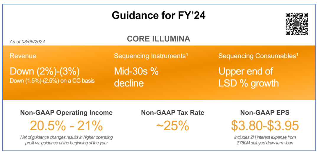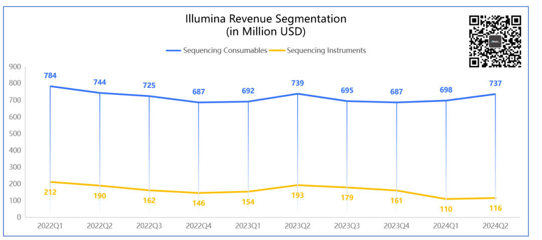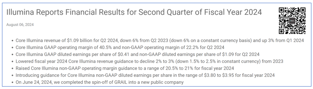 2024年8月6日盘后,NGS龙头Illumina发布了2024Q2财报。 财报显示,2024Q2 Illumina核心营收10.9亿美元,同比下滑6%,仍然不及去年同期。 不过,相较于2024Q1环比上升3%,止住了下跌趋势。