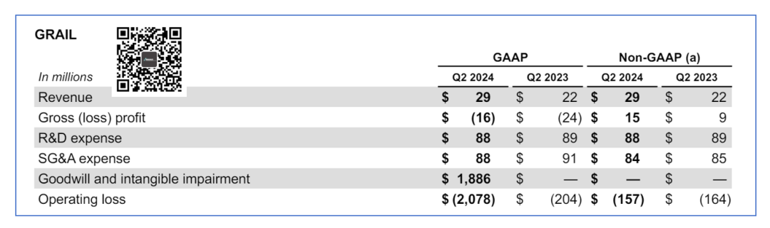 2024Q2 GRAIL营收2900万美元,商誉减值损失18.86亿美元,运营亏损20.78亿美元。 咱们一开始的问题答案也有了,本季度最大的亏损来自GRAIL。 谢谢“前女友”。 不过,这一条,算是CEO的KPI完成了。