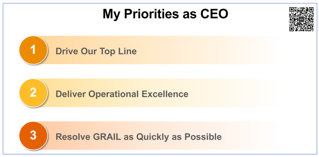 这第三个KPI就是“Resolve GRAIL as Quickly as Possible”,我们称之为分手。 说到GRAIL,Jacob只用了一张PPT、一句话:2024年6月拆分完成。 这里面的心酸,估计只能牙咬碎了往肚子里面咽了。 不仅仅是分拆GRAIL!Illumina的两件大事!