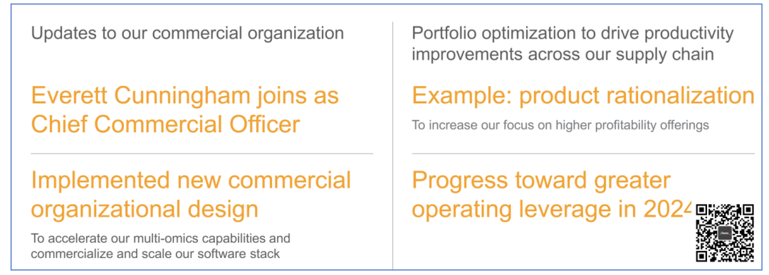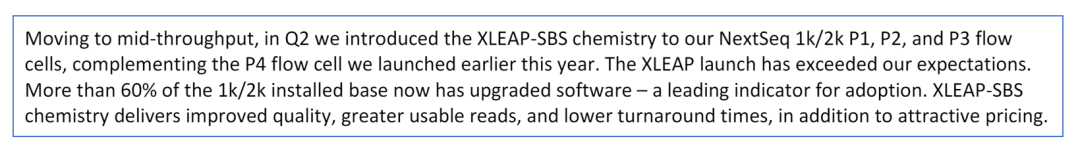 除此之外,通过对存量设备的升级,使NextSeq 1000/2000得以兼容最新版的XLEAP-SBS试剂,改善对客户的吸引力。 据说已经有60%的客户升级了,更快的交付、更好的数据质量,关键是更好的价格。 呃,这是变相承认Illumina被华大MGI和Element们逼入价格战了么? 总的来说,这个KPI完成的虽不尽如人意,但是也有点东西,至少2024没有出现连续两个季度的下滑。