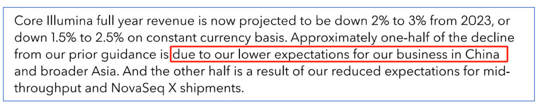 我们至少能从这段发言中看到三个关键点: 第一,CEO 仍然给了Jenny和中国市场一定的时间,保持了一定的耐心。 毕竟中国市场的竞争烈度天王老子来了都没用... “China still is an issue here, there is competitive pressure here..” Jacob在走访过程中想必也听到了、看到了,因此才有上面这段话,也因此才能更有耐心。 第二,Jenny对中国区的商业化架构进行了调整。 这当然对于消息灵通的朋友不是什么新鲜事(包括我们),但是受制于基本的职业操守无法跟大家分享。 这次,终于借CEO的口跟大家证实了。 第三,优化与合作伙伴的关系。 至于怎么优化的,并没有更进一步的信息,反正跟大客户们多走动走动、交流交流总是没错的。 这里还有个问题,既然叫优化,那是不是意味着以前... 第四,未来重心很可能更多向IVD倾斜。 这是有一定的逻辑的,在高通量集中化测序领域,MGI华大智造已经是一骑绝尘。 不论是T7的灵活,还是T20的终极性价比,都不是Illumina可以轻易撼动的。 不要忘了,后面还有真迈、赛陆虎视眈眈。 最后的最后,让我们看下Illumina今年的预期。