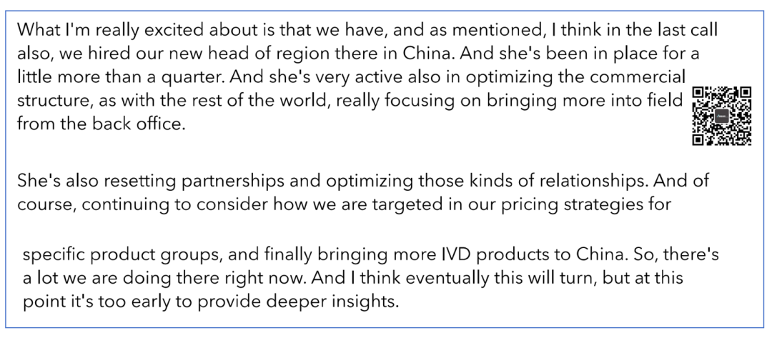 2024Q2 Illumina大中华区营收7500万美元,相较于2023Q2的1.15亿美元大幅下滑34.8%。 而且,我们可以非常明显的看到大中华区的销售额在近4个季度都在下滑... 这种情况的影响有多大呢?  大到影响到Illumina全年的财务指引都要据此进行调整。由于中国区和亚洲区域的业务不及预期,Illumina核心业务全年营收要下滑2%-3%。 当然,整个宏观环境的复杂多变。 这让曾经的“一路美”变得“没那么美”了。 当然,这其实不重要,我们关心的是新Head Jenny Zheng的新策略。 刚好,CEO在回答分析师提问的时候刚好有一段话能让我们窥测一下。