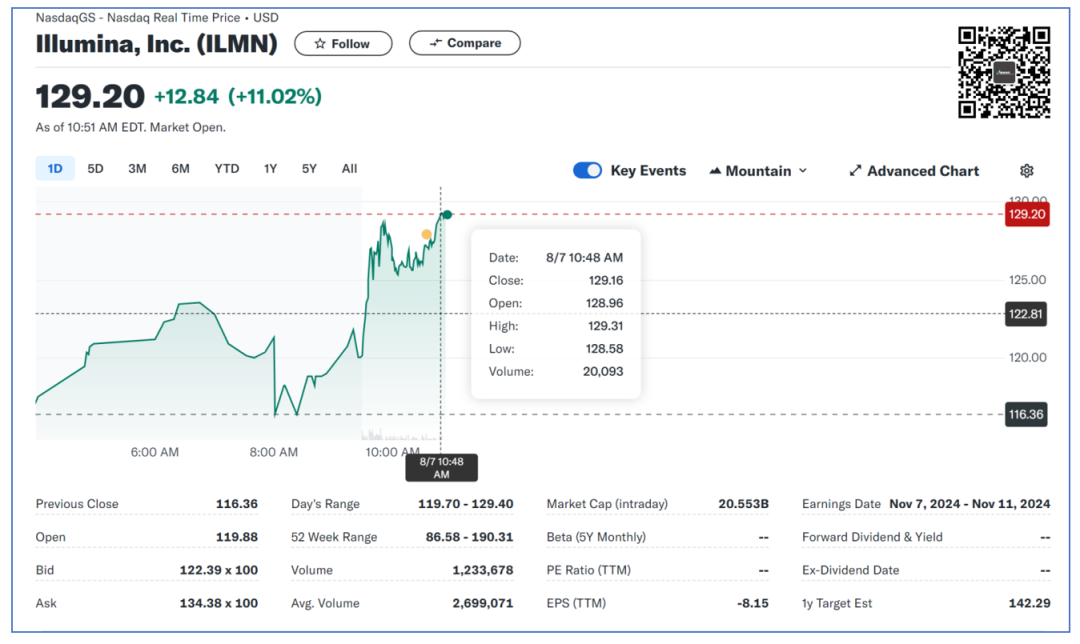 这昂扬的股价,有多少是为了摆脱GRAIL,有多少是为了光明的未来,只有投资人自己知道(也许并不)。 还有2个季度,我们也将继续关注。 相关资料:注1:https://investor.illumina.com/news/press-release-details/2024/Illumina-Reports-Financial-Results-for-Second-Quarter-of-Fiscal-Year-2024/default.aspx