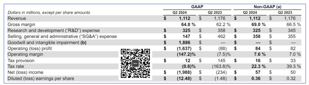 毛利率64.8%,相较于2023Q3的62.2%有所提高。 销售管理费用1.47亿美元,相较去年同期4.62亿美元大幅度较少(GAAP规则)。 整个季度净亏损19.88亿美元(猜猜为什么?),去年同期亏损2.34亿美元。