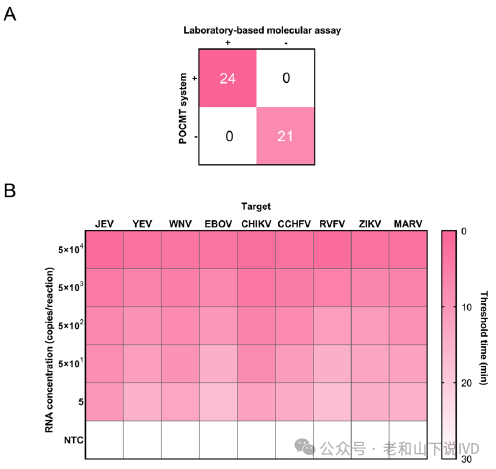 图6. 对每种病毒进行敏感性分析和定量检测 7. 系统对临床样本和加标样本的检测性能 使用临床标本进一步评估了该设备检测病原体的实际潜力。从疑似登革热患者中共采集了45份标本:21份为登革热阴性标本,24份登革热病毒阳性(包括登革热病毒载量高和低的标本)。阳性和阴性都与基于实验室的分子测定(RT-PCR)相同(图7 A)其中每个框内数字表示测试的数量。还从模拟临床样本中定量筛查九种病原体。热图显示了使用设备测量的Tt(图7 B)。可以看出在检测加标样品方面,该设备也表现出优异的性能,可以很好地区分阴性和阳性样品。