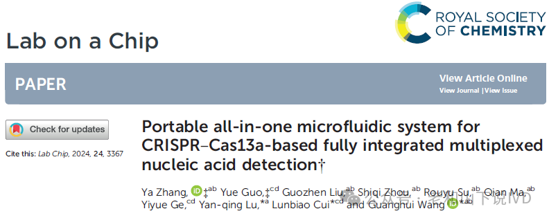 注:该文为最新科研动态新闻报道,如与原文作者有原创冲突,可与本公众号作者联系删除。 [1] Portable all-in-one microfluidic system for CRISPR–Cas13a-based fully integrated multiplexed nucleic acid detection. Lab on a Chip, 2024, 24, 3367.