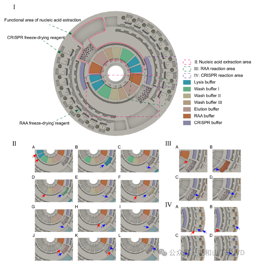 图2. POCMT系统的示意图 3. 微流控芯片操作流程 微流控芯片的操作方式如图3所示。核酸提取步骤如图3II所示。将200 μL血浆样品加入反应室,并与裂解缓冲液、蛋白酶K、丙烯酸载体和磁珠(MB)混合(图3I、II A)。将混合物在室温下摇动6分钟,以使MBs和核酸充分结合(图3II B)。之后,磁性切换结构变为磁性状态,用于固定反应室中的MBs,并将液体释放到废液室(图3II C)。然后通过石蜡阀控制500 μL洗涤缓冲液I、洗涤缓冲液II和洗涤缓冲液III依次洗涤MBs,每次洗涤10 s后排入废液室(图3II D-I)。最后,将500 μL洗脱缓冲液加入反应室。磁铁变为非磁性状态后,轻轻摇动3 min,以使MB上的核酸得到充分洗脱。然后,磁铁变为磁性状态,打开蜡阀,将模板释放到螺旋通道进行分配和计量(图3II J-L)。RAA步骤如图3 III所示。RAA缓冲液的石蜡阀打开(图3III A)。RAA缓冲液进入反应室(图3III B)。RAA缓冲液流入螺旋通道的加药室(图3III C)。将RAA缓冲液添加到RAA室中(图3II D)。将总计25 μL RAA反应混合物(12.5 μL模板和12.5 μL RAA缓冲液)在39 °C下孵育20分钟。CRISPR步骤如图3 IV所示。RAA腔室石蜡阀开启。测量2 μL后,剩余的液体流入废液室(图3IV A)。将2 μL RAA产物放入CRISPR室中。同时,打开CRISPR缓冲液的石蜡阀(图3IV B)。CRISPR缓冲液流入螺旋通道的加样室(图3IV C)。将CRISPR缓冲液添加到CRISPR室中(图3IV D)。将混合物在39°C下孵育15分钟,同时采集荧光信号。