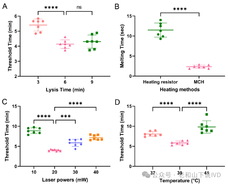 图3. 离心式微流控芯片整个操作过程示意图。(I) 试剂的装载。(II) 核酸提取步骤演示。(III) RAA步骤演示。(IV) CRISPR步骤演示。红色箭头:石蜡阀打开的位置。蓝色箭头:试剂的流动方向。 4. 优化检测时间和性能 图4显示了四个不同参数对检测时间的影响。图4A比较了裂解时间对核酸提取效率的影响,阈值时间(Tt)的最低值表明6 min足以在芯片中裂解细胞。裂解时间减少或增加,Tt值均增加。图4B比较了两种加热元件的加热效率。金属陶瓷加热器(MCH)比加热电阻器效率更高,能在更短的时间内融化石蜡。图4C比较了不同激光功率对阈值时间的影响,在20 mW的激光功率下,Tt值最低。激光功率减少或增加,Tt值均增加。图4D比较了不同温度对RAA的影响,可以看出最适反应温度为39 °C。温度升高或降低,Tt值均增加。