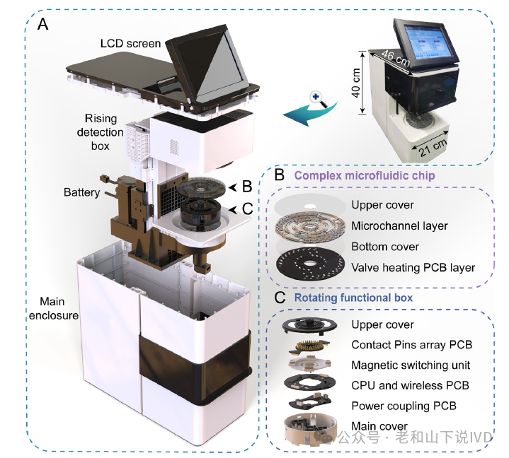 近年来,全球发生过由埃博拉病毒、登革热病毒、寨卡病毒等传染病病原体引发的重大突发公共卫生事件,造成了人类的大量死亡。然而,感染这些病原体时表现出相似的临床症状。因此,迫切需要一种快速、全面的多种病原体检测方法。实验室检测方法如免疫分析法、微生物培养法和核酸检测等通常需要经过专门培训的技术人员、昂贵的设备和复杂的操作步骤。近年来,微流控和生物检测技术的进步为改进传染病诊断的即时检测(POCT)提供了解决方案。等温扩增方法,如重组酶聚合酶扩增(RPA)、重组酶辅助扩增(RAA)和环介导等温扩增(LAMP)在POCT的检测中具有广阔的应用前景,但其结果具有高非特异性。基于成簇规则间隔短回文重复序列(CRISPR)技术和PfAgo蛋白的应用提高了核酸检测的灵敏度和特异性。南京大学王光辉团队开发了一种集成了包括基于磁珠的核酸提取、RAA和CRISPR-Cas13a检测的便携式离心微流控检测(POCMT)系统。该系统一步上样后,可同时检测10个靶点。系统快速检测周期短至45 min(核酸提取:10 min,RAA:20 min,CRISPR/Cas13a:15 min)。通过使用一体化芯片,多重检测的限值降低到在使用核酸模板的情况下为每个反应1个拷贝,在模拟血浆样品中每个反应5个拷贝。相关成果以“Portable all-in-one microfluidic system for CRISPR-Cas13a-based fully integrated multiplexed nucleic acid detection”为题发表在Lab on a Chip杂志上。1. 微流控检测系统 团队构建的POCMT装置如图1A所示,设备配备了用于旋转控制的高精度伺服电机和用于温度控制的空气加热装置。它还有一个可充电锂聚合物电池,可应用于没有电源的情况。微流控芯片如图1B所示,该芯片由四层组成,包括上芯片盖、带有雕刻双侧通道和嵌入石蜡阀的微通道层、底部芯片盖和用于阀门加热的印刷电路板(PCB)层(带底部焊盘)。旋转功能盒结构如图1C所示,包括用于无线供电的非接触式耦合线圈模块、一个CPU和一个用于接收和执行指令的ZigBee通信模块。它还具有用于磁状态控制的磁性开关结构,用于片上核酸提取过程中洗涤MBs。在芯片上方,有一个电机驱动的检测盒,其中包含4个集成的光学检测模块,用于荧光激发和测量。便携式设备采用嵌入式Android系统操作,操作人员只需选择一个操作程序文件,其中包含所有详细设置,例如反应时间、温度等,结果和结论都显示在液晶显示屏上。