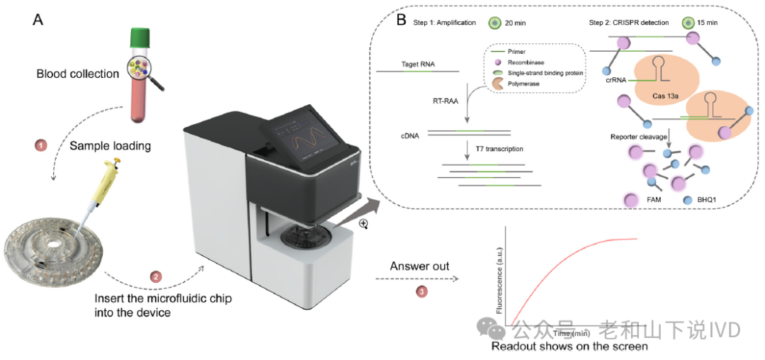 图1. POCMT装置和微流控芯片的设计 2. 微流控检测系统检测流程 系统检测流程如图2所示。血浆样本在便携式设备中自动测试,并监测输出荧光信号(图2A)。用户只需将样品注入芯片中,仪器就会完成以下全过程。首先,将200 μL血浆样品加入芯片中,然后通过选择相应的程序开始检测。在石蜡阀依次打开的情况下,试剂依次释放。通过切换磁性状态,实现了高效的核酸洗涤和富集。通过改变结构,提取的RNA产物被释放到RAA室。然后,将空气加热单元设置为39 °C,持续20分钟,直到反应结束。在CRISPR检测15分钟期间,小型化荧光检测模块进行工作(图2B)。激发的荧光信号由光电探测器收集。荧光采集数据可以实时显示在屏幕上。在设备中执行时,通过荧光信号在阈值读数上评估样品的病毒载量。阈值时间(Tt)为荧光信号在检测阶段达到阈值所需的时间。