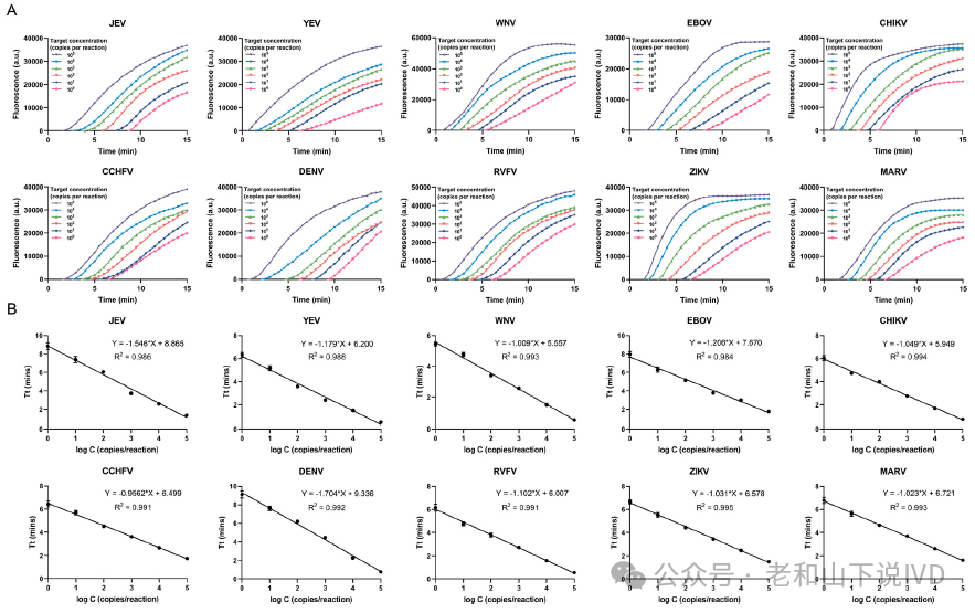 图5. 每种病毒的特异性分析 6. 系统灵敏度分析 对所有质粒样品,即JEV、YEV、WNV、EBOV、CHIKV、CCHFV、DENV、RVFV、ZIKV和MARV,均用血浆样品以 10 倍梯度稀释。对于JEV、YEV、WNV、EBOV、CHIKV、CCHFV、DENV、RVFV、ZIKV和MARV,该平台在5拷贝/mL的稀释水平下仍可检测(图6A)。实验结果表明,使用POCMT系统对10种病毒每次反应的检测下限(LOD)为1个拷贝。图6 B显示了10种检测到的病毒的浓度与Tt值之间的关系。Tt值与所有10种病毒的质粒样品浓度呈对数关系,每个反应105至1个拷贝,决定系数(R2)均在0.98以上。这些结果表明,离心微流体平台具有定量检测的潜力。该系统适用于传染病病原体的快速准确鉴别诊断。