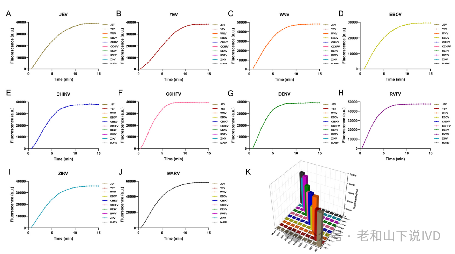 图4. 优化检测时间和性能 5. 系统特异性分析 为了评估检测系统的特异性,进行了交叉反应性测试。反应室预装了10种病毒的试剂,以验证特异性。代表单一传染病病毒感染的所有十个血浆样本在相应设计的腔室中都显示出阳性结果,其他反应室表现出阴性结果(图5A-J)。其中A-J分别为日本脑炎病毒(JEV)、黄热病病毒(YEV)、西尼罗河病毒(WNV)、埃博拉病毒(EBOV)、基孔肯雅病毒(CHIKV)、克里米亚-刚果出血热病毒(CCHFV)、登革热病毒(DENV)、裂谷热病毒(RVFV)、寨卡病毒(ZIKV)和马尔堡病毒(MARV)。阳性信号显示为实时曲线,而阴性信号未达到荧光阈值。由特异性直方图(图5K)可以看出该系统在10种病毒之间没有交叉反应性,具有优异的特异性。