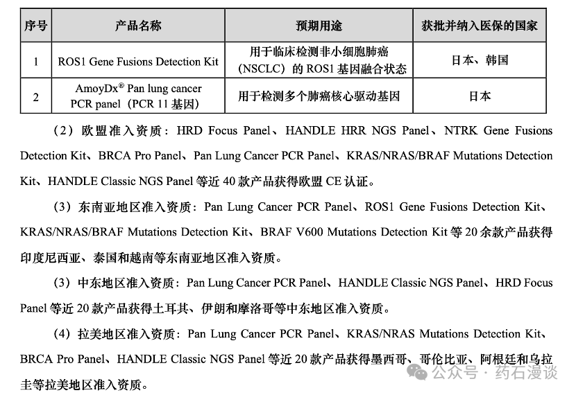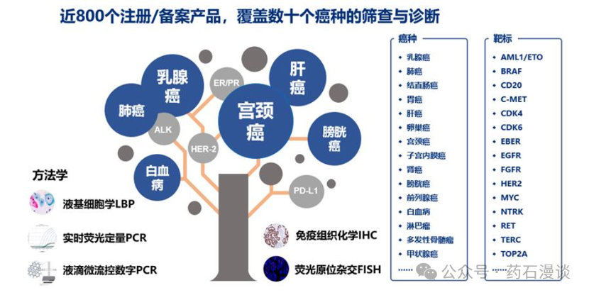 另外从死亡病例的肿瘤来看,肝癌、结直肠癌死亡比例与发病比例接近1,为什么会出现如此情况?主要从临床反馈来看,主要是发现肝癌和结直肠癌,基本都是中晚期,存活率直线下降。肿瘤的诊断(肿瘤基因检测),覆盖从肿瘤早期筛查、辅助诊断、伴随诊断、疗效监测、复发预测等肿瘤精准治疗全流程都可以进行对应诊断,这也是分子诊断可以介入肿瘤诊断和治疗的路径,不同的企业可以根据自己的技术优势,选择肿瘤诊断的不同阶段,开发出适合临床的产品,从而切入肿瘤诊断市场。在前面的文章中《“肿瘤君”的分子诊断的肿瘤早筛“玩家”》已经介绍了基于PCR技术和NGS技术进行癌症早筛的诊断试剂企业,今天简单撰述一下,切入肿瘤诊断和肿瘤伴随诊断的企业。临床上目前主要有两个技术平台的应用:免疫组化和分子诊断。免疫组化更多应用于肿瘤的诊断,毕竟病理切片作为癌症诊断的金标准,这是临床不可或缺的,病理切片则更多依赖于免疫组化法的切片染色。免疫组化也有个别应用于伴随诊断,如PD-L1免疫组化诊断就是应用于非小细胞肺癌的单抗用药的必要检测,但总的肿瘤伴随诊断则更多在临床应用则必须依靠于分子诊断技术。伴随诊断的应用不得不提到艾德生物。作为分子诊断四小龙之一,其年营业收入已经达到10亿元,且长期耕耘于肿瘤的伴随诊断。 艾德生物积极利用分子诊断(PCR技术)在医院内展开对应的肿瘤伴随诊断业务,虽然与竞争对手进行的临床外送服务相竞争,但是面对当下临床监管越来越严格,尤其是临床样本外送服务,在上海市出台第一份相关规范性文件后,陆续有其他省份出台相关政策,这或许也会给艾德生物再次提升业绩的机遇。艾德生物具备肺癌、结直肠癌、卵巢癌、前列腺癌、乳腺癌、甲状腺癌、黑色 素瘤等癌种,以伴随诊断试剂为核心,打造了从上游的样本处理/核酸提取,到下游的自动报告和数据管理系统的肿瘤精准检测整体解决方案。其技术平台则涵盖了PCR、NGS、IHC、FISH等,在已经获批Ⅲ类26种肿瘤基因检测 IVD 产品基础上,公司按照Ⅲ类 IVD 产品开发标准,储备了丰富的 LDT 产品线并正在进行注册报批(如指导卵巢癌/乳腺癌/前列腺癌/胰腺癌 PARP 抑制剂用药的 HRD、HRR 产品,指导泛癌种靶向治疗检测的Classic Panel,满足泛癌种多组学检测需求的 Master Panel,以及多款分子分型、辅助诊断和肿瘤早测产品)。另外,为了更好地应用于临床的伴随诊断,艾德生物积极与药企合作,一方面推动自己伴随诊断试剂的上市速度,也可以推动药物的上市推广速度。截止目前已经与与 AstraZeneca(阿斯利康)、LOXO ONCOLOGY(礼来制药子公司)、Johnson & Johnson(强 生)、Pfizer(辉瑞)、Amgen(安进)、MERCK KGaA(默克)、EISAI(日本卫材)、Takeda (武田)、Pierre Fabre(皮尔法伯)、Hengrui(恒瑞)、BeiGene(百济神州)、CStone(基石)、 HUTCHMED(和黄)等国内外众多知名药企达成伴随诊断合作。艾德生物也积极拓展海外市场,其研发的产品在海外也渐渐崭露头角。如伴随诊断产品ROS1及PCR-11基因在日本等国家获批并纳入当地医保。 广州安必平则是另一家专注于免疫组化诊断的上市公司,其2023年营业收入接近5亿元。是国内病理诊断领域首家上市公司,集研发、生产、市场、服务、教育五位一体,构建了肿瘤筛查、肿瘤诊断、数智病理、病理服务四大业务,专注于肿瘤筛查与精准诊断,围绕医院病理科“标准化、自动化、数字化、智能化”的四化建设,自主研发了常规病理、液基细胞学(LBP)、聚合酶链式反应(PCR)、免疫组织化学(IHC)、荧光原位杂交(FISH)、数字病理等技术平台的配套设备、试剂耗材,注册/备案产品数量超800个,是国内病理产品线最齐全、最丰富的企业之一。公司部分产品已获得 CE 欧盟、英国标准协会(BSI)、日本厚生劳动省的认证。公司凭借种类齐全的产品线、自主研发品牌试剂和仪器的协同优势、完善的营销网络及优质的售后服务体系,已覆盖国内 2,200多家医疗机构及部分海外市场。 在2023年度报告期内公司与多家药企形成伴随 诊断合作关系,部分项目已完成注册检验,其中伴随诊断产品 C-Met 抗体试剂(免疫组织化学)与阿斯利康达成战略合作,共同在临床端推广公司产品。另外安必平ALK基因重排检测试剂盒用于临床非小细胞肺癌用药克唑替尼的伴随诊断。另外根据上市年报显示,其为提升病理科“四化”——自动化、标准化、数字化与智能化水平,推出一系列数字病理产品:将互联网、大数据、云计算等前沿技术与已有的成熟产品相融合。报告期内,自主研发的通量为 240 片的“全自动数字切片扫描系统”、“病理影像存储与传输系统软件”陆续获得二类医疗器械注册证并推向市场。公司还开发出“实视”实时镜下视野共享系统和“爱病理”病理医生社区 APP 并持续运营,“爱病理”病理医生社区APP已成为国内病理领域交流最活跃的线上社区之一,“爱病理”实名注册用户3.35万人,进行过7400多节的实时病例更新讲解,完成了4万多次的远程咨询。病理科数字化的推进,实现数据的云上存储,可提高病例标本的使用效率,一定程度上也可降低医疗成本,也会为数据联网和远程会诊奠定基础,当然也是向数字化路径上的必然之路。同时根据国家分级诊疗的政策,积极布局基层医疗机构病理科,利用第三方医学检验所和病理诊断中心资质,参与各地医联体、专科联盟的建设,以