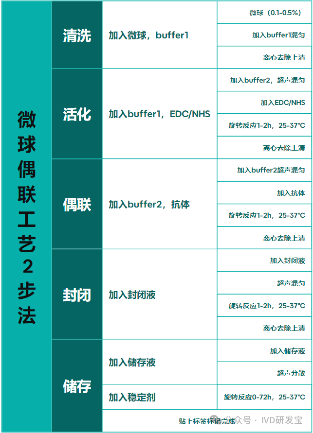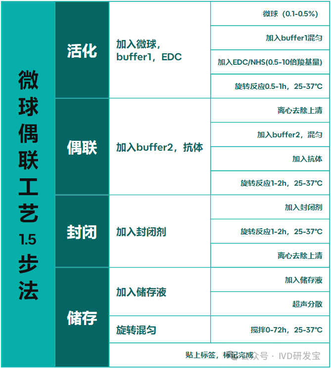 1.5步法微球标记抗体工艺。活化和偶联使用了两种buffer,且先使用EDC/NHS对微球进行活化,过程中增加了离心步骤。