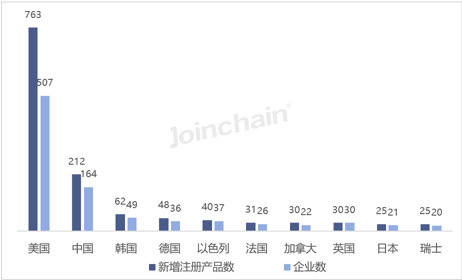 据众成数科(JOINCHAIN)统计,在2024年上半年获得美国境内医疗器械产品注册证的国家中,美国以763件产品位居榜首,占比47.16%,涉及企业507家;中国(不含香港、澳门、台湾)排在第二,产品数量为212件,占比13.10%,涉及企业164家;排名第三的是韩国,新注册产品数量为62件,占比3.83%,涉及49家企业。