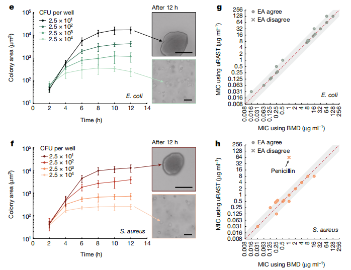 作者设计了一种定制的96孔AST芯片用于MIC测定和敏感性分析。接种量大小设置为每孔500 CFU,输入AST共计5×104个细胞,相当于大约6小时的快速培养(图e,f)。使用大肠杆菌和金黄色葡萄球菌评价各种抗生素的MIC,以研究AST的准确性(图g,h)。结果显示与BMD结果相比,大肠杆菌和金黄色葡萄球菌的总体基本一致性分别为100%和93.3%。