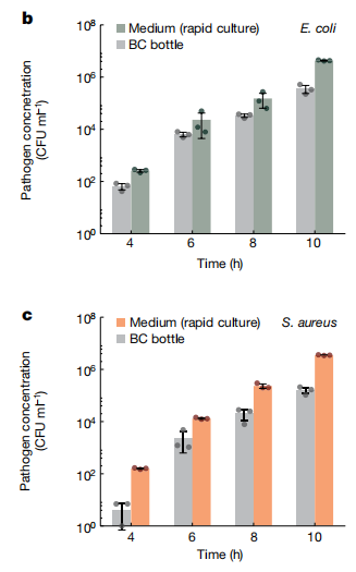 与QmapID平行,在富集过程中收集的血液纯化病原体也用于AST(图b,c)。结果发现,与标准血液培养方法相比,去除血液成分的纯培养基中的病原体生长显著增强,大肠杆菌和金黄色葡萄球菌培养10 h后,其浓度分别增加了9.76倍和19.01倍。