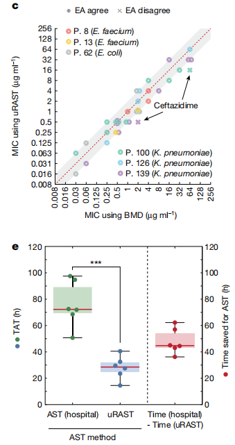 对QmapID鉴定的感染阳性血液样本进行选择性回顾性uRAST检测。将结果与BMD比较,总体分类一致性为94.90%(图c),符合FDA要求。与医院AST相比,应用uRAST显著改善了TAT,平均降低了47.99±9.69h(P<0.0001)(图e)。