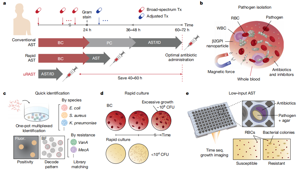 作者提出了一种基于表型的超快速AST(uRAST)平台,能够直接从患者的全血中进行药物敏感性分析,避免了血液培养的需要。此外还介绍了一种高度敏感的、无需培养的病原体ID检测方法,可提供物种信息,这对精确的AST解读至关重要。此方法理论上可减少TAT超过40-60小时,使快速抗生素处方成为可能。