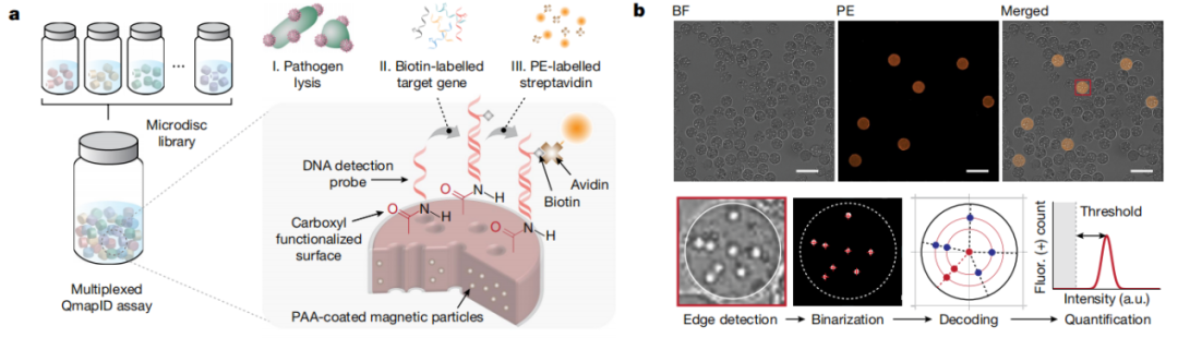 为了鉴定致病菌类型,作者开发了一种使用形状编码的微盘的快速定位ID检测方法(QmapID)(图a)。该方法包括一个微盘文库,每个微盘上固定着单链DNA探针,可以杂交相应病原体的基因组序列。从富集溶液中裂解细菌细胞以提取基因组DNA(gDNA),然后使用两步巢式PCR和生物素标记进行扩增。然后将扩增子杂交到特定的微盘上,并使用荧光染料进行探测成像。通过解码孔穴模式和荧光强度分布和平均值分析,可在3h内验证细菌特异性基因的存在(图b)。