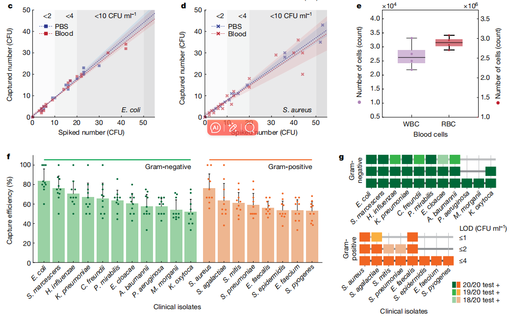 作者使用了合成的β-2-糖蛋白I(sβ2GPI)肽修饰的磁性纳米颗粒,从血液中富集病原体。采用优化后的方案,对1000 CFU ml−1大肠杆菌和金黄色葡萄球菌的捕获效率分别为96.23 和91.54%。使用低负荷(1-10 CFU ml−1)大肠杆菌、肺炎克雷伯菌、铜绿假单胞菌、金黄色葡萄球菌和粪肠球菌进行了效率测试,结果显示虽然产量略有下降,但所有菌株均被成功捕获(图c、d)。