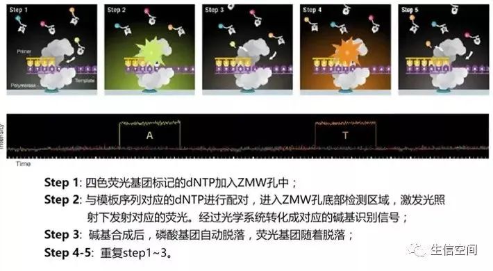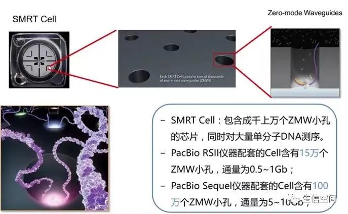 基本原理:Pacbio仍然采用边合成边测序的原理,但实现了两个重要的技术突破。一个是将荧光分子标记在磷酸上,这样在反应停止且捕获荧光信号以后,可直接随磷酸基团脱落,解决了因噪音污染导至的读长很短的问题;二是由于不需要PCR扩增,信号的有效提取成为了关键。通过引入零模波导孔(ZMW)技术解决这一问题。在纳米室底部有一个孔径70nm的小孔,由于远远小于激光的波长,所以激光从底部照射时,只会照亮一个小的区域,提高了信噪比。