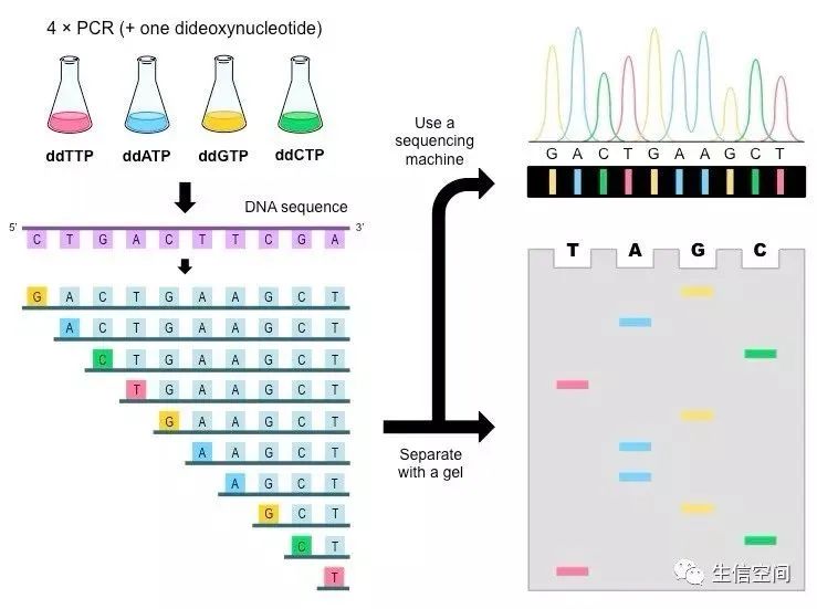 在每个反应体系中,ddNTP相对于dNTP是很少的,所以只有部分新链在不同的位置特异性终止,最终就会得到一系列长度不一的序列。