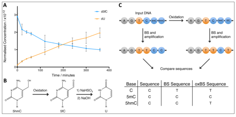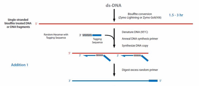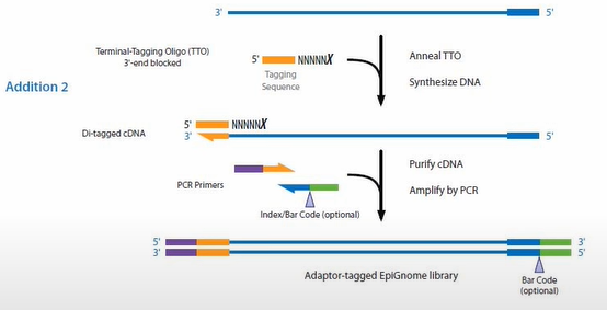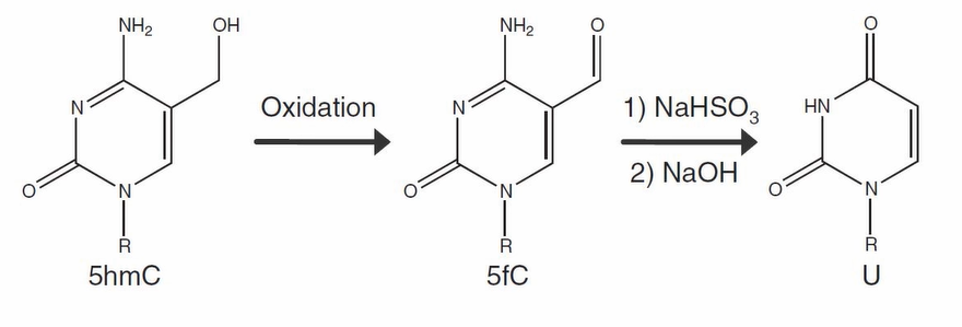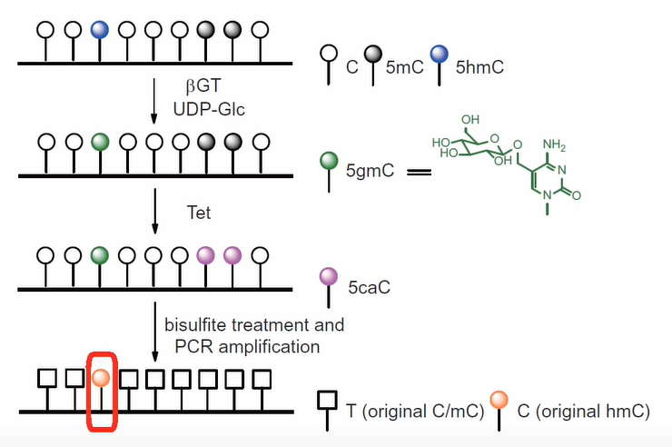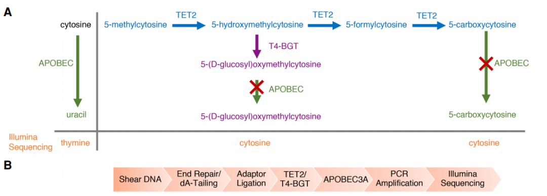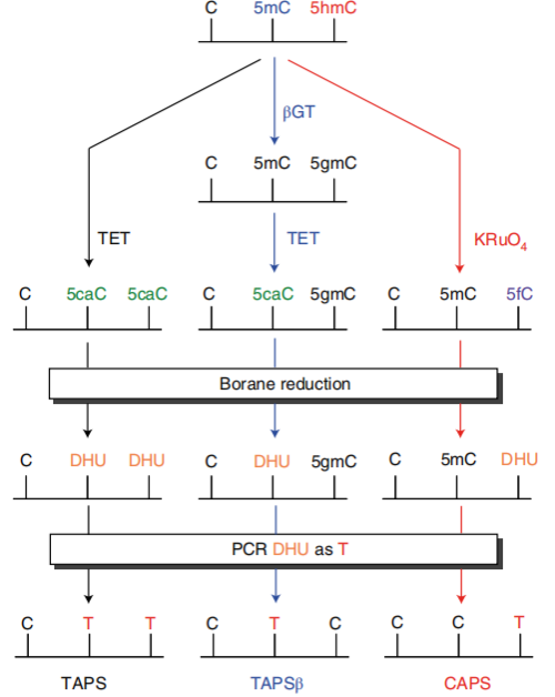 1、重亚硫酸盐测序BS-Seq 1)先建库再转化 在illumina Truseq DNA建库试剂盒当中,其接头上的C已经经过甲基化修饰,因此,用这些接头建库后,在上述转化过程中,接头上的⁵ᵐC不会被转化成U。 在用亚硫酸氢盐处理DNA文库时,90%以上的 DNA链会断掉,文库的丰富度就会损失90%以上。 2)先转化再建库 ①单链建库 重亚硫酸氢盐会将dsDNA解链成ssDNA,所以需要进行单链DNA建库。 ②EpiGnome甲基化建库 a.用重亚硫酸氢盐处理DNA,将未甲基化的C都转成U。 b.把带标签1的随机引物1加入,进行第一次的复制,得到第1条的复制链。 c.消化掉过量的引物1。 d.加入带末端终止碱基、并带标签2的随机引物 2。从而让第一复制链延伸且加上标签2,同时使 PCR得以正常进行。 e.加入建库的PCR引物,进行PCR。通过PCR,把 Index序列和成簇引物序列加入到链的两侧,得到测序可用的文库。 2、TAPS甲基化测序 3、酶法甲基化测序(EM-seq) Enzymatic Methyl-seq(EM-seq)通过酶法完成WGBS建库,其对DNA的酶处理分为两步: 第一步使用TET2酶以及氧化增强剂将⁵ᵐC和⁵ʰᵐC氧化成⁵ᶜᵃC,保护经过修饰的胞嘧啶; 第二步利用脱氨酶APOBEC对胞嘧啶进行脱氨处理,此步骤不会对5caC造成影响,从而实现⁵ᵐC和⁵ʰᵐC的检测。 1、氧化亚硫酸氢盐测序oxBS-seq 通过高钌酸钾(KRuO₄)氧化羟甲基化的C,将其转化成甲酰化的5fC。甲酰化的C碱基,可以被重亚硫酸氢盐转化成U;而甲基化的C,不会被转化成 U。这样就把⁵ʰᵐC和⁵ᵐC给区分开来了,可以特异性的检测⁵ᵐC。 研究表明,该反应转化效率是94%左右,同时⁵ᵐC只有 2.1%会被转化成⁵ᶠC。 2、TAPSβ TAPSβ也是用糖基化酶把羟甲基化的C给保护起来,使其免受TET氧化。 再使用TET酶将甲基化的C转化为羟甲基化的C再转化成甲酰化的C和羧基化的C。 ⁵ᶜᵃC则可在吡啶硼烷还原为二氢尿嘧啶,而被保护起来的羟甲基化的C则不变。经过后续步骤测序则可特异性的区分⁵ᵐC。 1、BS-Seq和oxBS-Seq联合测序 可实现对⁵ʰᵐC单碱基分辨率的检测。 2、TET辅助的重亚硫酸盐测序(TAB-seq) ①先用糖基把⁵ʰᵐC保护起来,变成⁵ᵍᵐC。 ②再用TET酶把⁵ᵐC转变成⁵ʰᵐC,再转化成⁵ᶠC和羧基化的⁵ᶜᵃC。甲酰化的C和羧基化的C都可以被重亚硫酸氢盐转化成U。 ③之前被糖基化保护起来的⁵ʰᵐC,则不会被TET 蛋白转化成甲酰化的C或者羧基化的C。在重亚硫酸氢盐的处理过程中,它还保持是C,从而将⁵ʰᵐC和⁵ᵐC区分开来,特异性的检测⁵ʰᵐC。 这个方法,没有甲基化的C,99.6%都被转化成了 U;甲基化的C,97.7%都被转化成了U;而羟甲基化的C,只有8%被化成了U。也就是说本法理论转化效率能达到92%。 知识贴:转化效率和内参 为了对实验的转化效率进行质量控制,一般会在转化实验当中加入内参对照品。 1、阴性内参 利用甲基化酶缺陷型大肠杆菌,通过其所生产的完全没有被甲基化的λ(噬菌体)DNA或者pUC19p-primer-质粒)DNA做内参,来看一次实验当中C的转化效率。 实际操作中,一般会选择加入1%的完全没有甲基化的λ DNA做内参。 2、阳性内参 用CpG岛完全被甲基化的DNA来跟踪甲基化DNA对转化的抵抗效果作为参数。 3、APOBEC偶联甲基化测序(ACE-seq) 该技术使用AID/APOBEC家族DNA脱氨酶APOBEC3A (A3A)代替化学脱氨,保证了DNA的完整性。 首先,利用T4 β-葡糖基转移酶(βGT)将⁵ʰᵐC转化成⁵ᵍᵐC,⁵ᵍᵐC不会被A3A酶脱氨基,这样A3A能够特异地脱去C及⁵ᵐC的氨基使其变为U。 而⁵ʰᵐC则因为不被该酶识别,测序时仍被检测为C,这样,⁵ʰᵐC与C及⁵ᵐC就区分开来,实现特异性检测⁵ʰᵐC。 4、CAPS技术 CAPS仍利用了oxBS-seq中高钌酸钾KRuO₄将DNA上的⁵ʰᵐC氧化成⁵ᶠC,⁵ᶠC也可经吡啶硼烷的衍生物(pic-borane)还原成二氢尿嘧啶,从而实现特异性的检测⁵ʰᵐC。 [1]《陈巍学基因》笔记(12)甲基化测序-珠江肿瘤 [2]干货|DNA甲基化和DNA羟甲基化测序技术及5mC和5hmC测序方法-翌圣生物 |