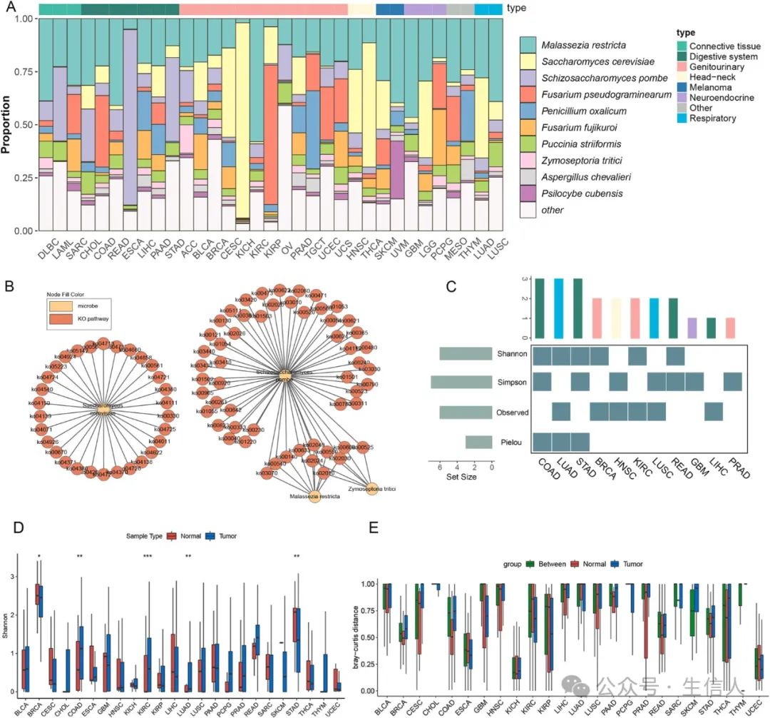 最后,β多样性分析表明,细菌组成与食管癌(ESCA)、GBM和UCEC的发生有关(图2E),而未发现真菌组成在肿瘤组织和非肿瘤组织之间的影响(图3E)。