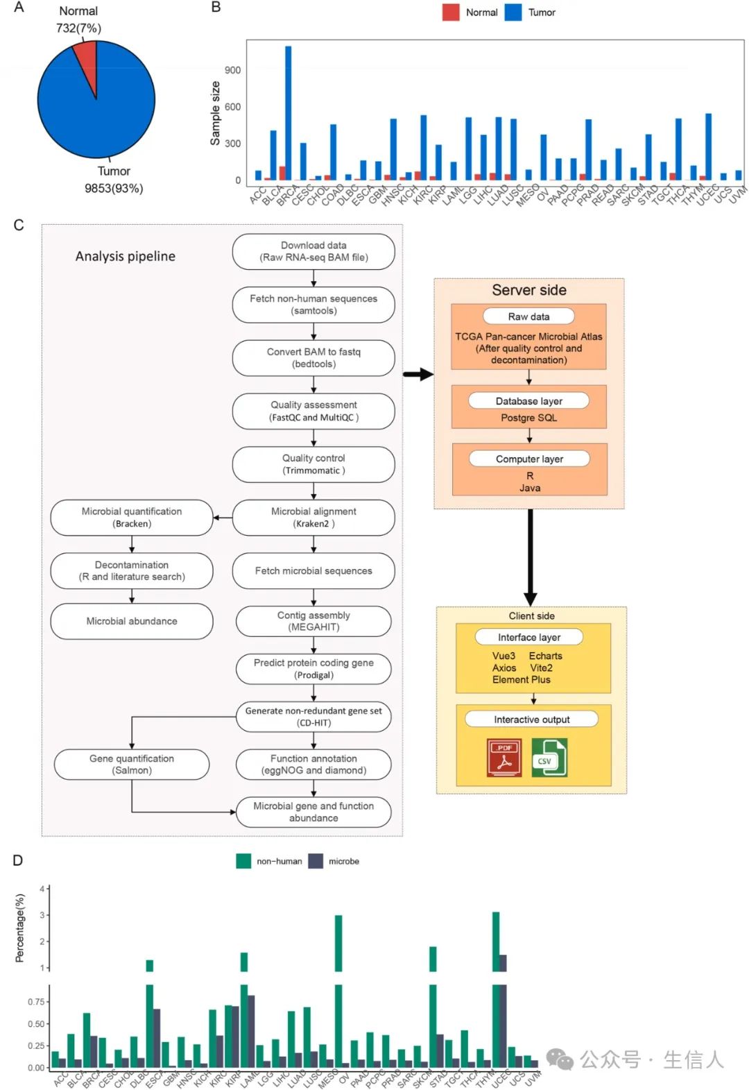 本研究对TCGA 的全转录组测序数据进行了重新分析,以研究肿瘤中是否存在细菌和真菌。为确保微生物注释的准确性和可靠性,对原始测序数据进行了质量控制。此外,还将人类参考基因组 GRCh38 纳入非冗余微生物参考基因组数据库,以尽量减少人类序列对微生物特征的影响。考虑到样本采集、处理和测序过程中可能会出现污染,在方案中加入了净化步骤。探索肿瘤内细菌和真菌在各种癌症中的生物学功能对于开发新型癌症诊断和治疗策略至关重要。在本研究中,主要重点是系统评估肿瘤内微生物群在肿瘤发生和免疫微环境中的生物学意义。此外,还旨在确定肿瘤驻留微生物群的潜在预后价值。为了促进对肿瘤内微生物群的探索,开发了 TCMbio(癌症微生物群数据库),这是一个互动工具,可提供 33 种癌症的肿瘤内细菌和真菌的物种级数据。TCMbio 提供用户友好的界面和全面的工作流程,包括快速和可定制的功能,有助于肿瘤内微生物组研究。