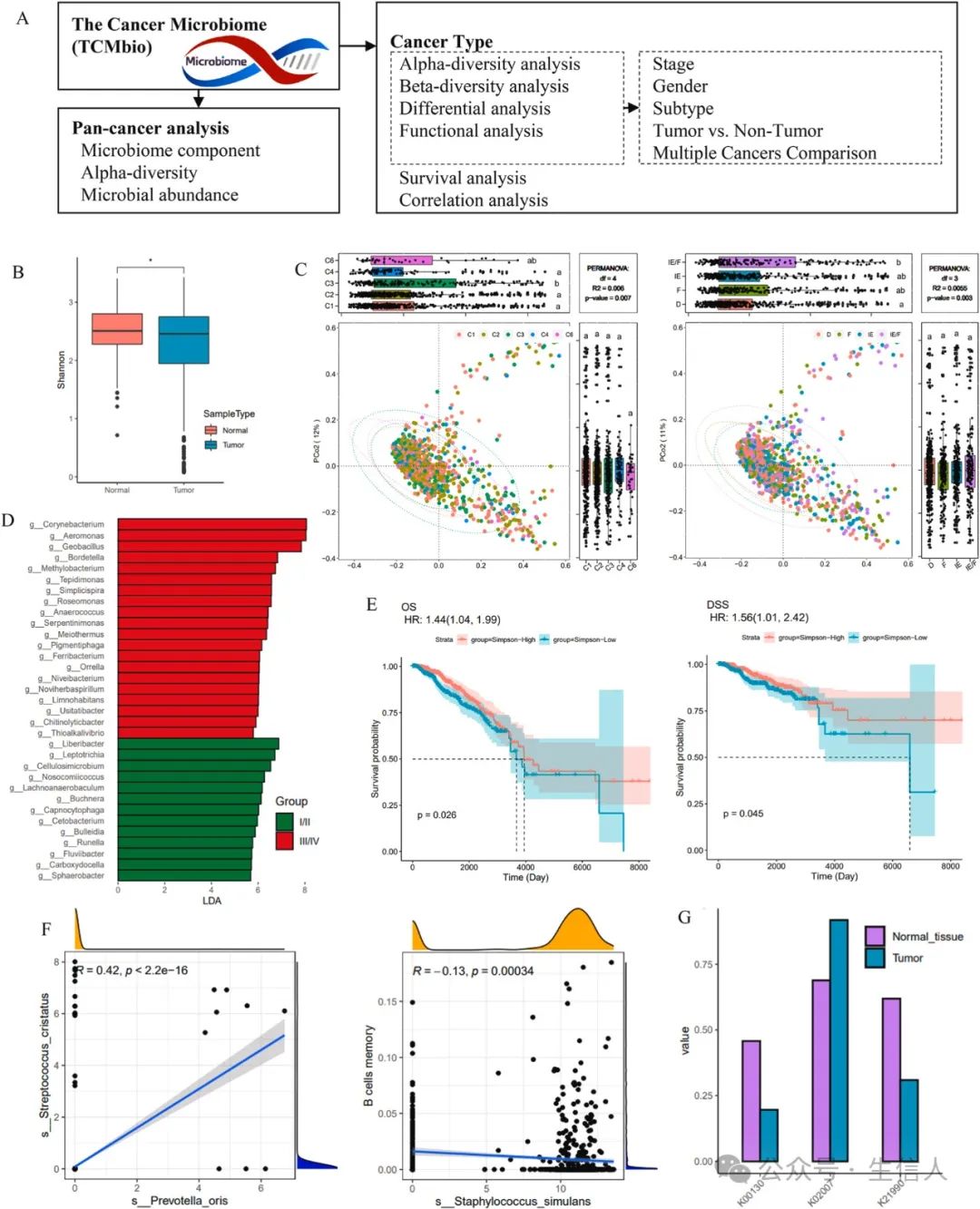 研究开发了一款名为 TCMbio 的交互式网络工具,它由两个主要模块组成:泛癌分析和 TCMbio 中的癌症类型分析(图 7A)。泛癌模块包括三个选项卡:微生物组成分、α多样性和细菌差异分析。在癌症类型分析方面,TCMbio 提供了多种针对特定癌症类型的分析,包括α多样性分析(图 7B)、β多样性分析(图 7C)、微生物差异分析(图 7D)、生存分析(图 7E)、相关性分析(图 7F)和微生物组功能分析(图 7G)。用户可以根据不同性别、肿瘤分期、免疫亚型、多种癌症类型以及癌症与正常对照组,灵活地进行上述分析。此外,它还可以探索与生存相关的微生物,以及特定癌症类型中微生物丰度、基因表达和免疫特征之间的相关性(图 7A-G)。一旦提交了分析请求,TCMbio 就会向用户提供可供出版的表格和矢量图像结果,用户可以轻松地免费查看和下载这些结果。