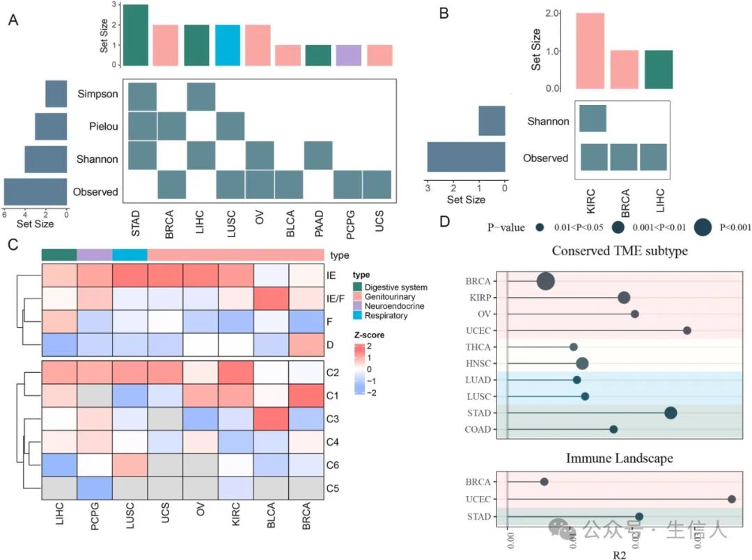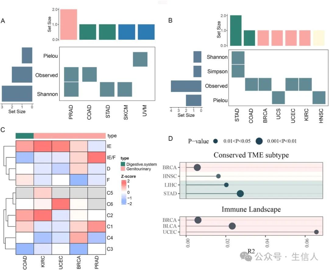 根据以往的研究,研究了不同免疫类型微生物组组成的差异。Bagaev 等人确定了4种保守的TME亚型:免疫富集非纤维化亚型(IE)、免疫富集纤维化亚型(IE/F)、纤维化亚型(F)和耗竭亚型(D)。Thorsson 等人确定了6种肿瘤免疫亚型:伤口愈合型(C1)、IFN-γ优势型(C2)、炎症型(C3)、淋巴细胞耗竭型(C4)、免疫静默型C5)和 TGF-β优势型(C6)。