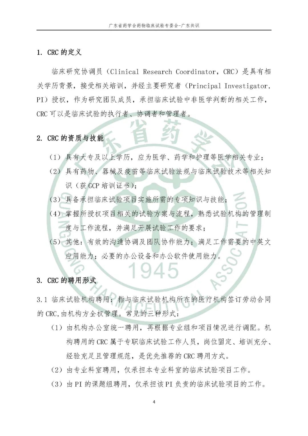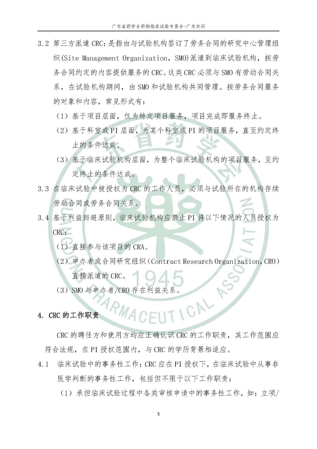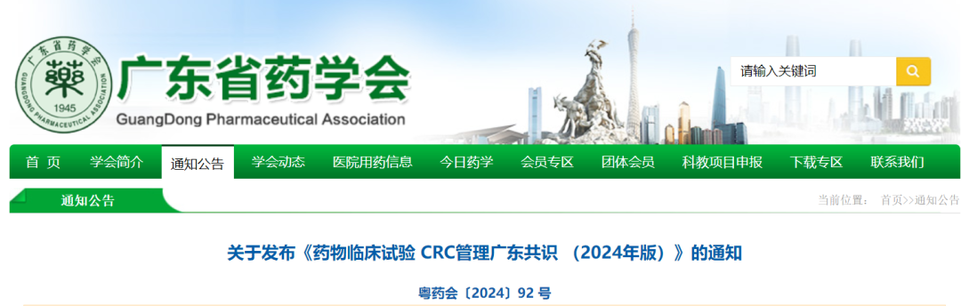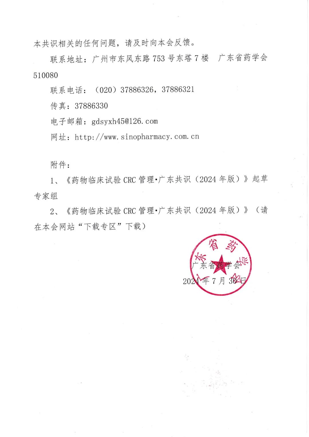 关于发布《药物临床试验 CRC管理广东共识 (2024年版)》的通知 粤药会〔2024〕92 号 发布时间:2024-07-30 各医疗机构: 临床研究协调员(Clinical Research Coordinator,CRC)作为研究团队一员,是临床试验实施过程的重要参与者。现行法律法规鲜见关于CRC的明确要求,行业内缺乏统一标准及质量控制。为规范CRC管理,广东省药学会药物临床试验专业委员会在2015年印发了《药物临床试验 CRC管理•广东共识(2014)》,并于2020年进行第一次更新。自2020年以来,CRC发展已形成行业规模,CRC的职责与任务在认识上已基本达成共识,但行业现状仍存在CRC资质参差不齐、各临床试验机构对SMO及CRC 的管理方式与要求各异、聘任方和使用方对CRC的培训与工作缺少监督、研究者对CRC职责认知不够等,这些都可能导至临床试验风险增加。广东省药学会药物临床试验专业委员会特组织专家团队对《药物临床试验 CRC管理•广东共识(2020年版)》进行了更新完善,现予以发布《药物临床试验 CRC管理·广东共识(2024年版)》,供各医疗机构参考。各医疗机构在执行过程中遇到与本共识相关的任何问题,请及时向本会反馈。 联系地址:广州市东风东路753号东塔7楼 广东省药学会 510080 联系电话:(020)37886326,37886321 传真:37886330 电子邮箱:gdsyxh45@126.com 网址:http://www.sinopharmacy.com.cn