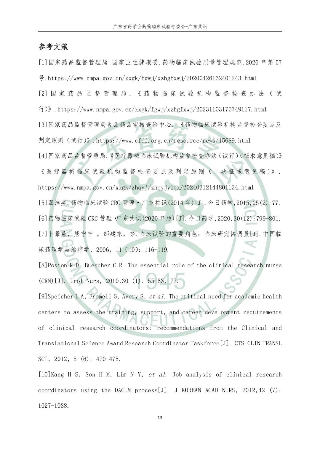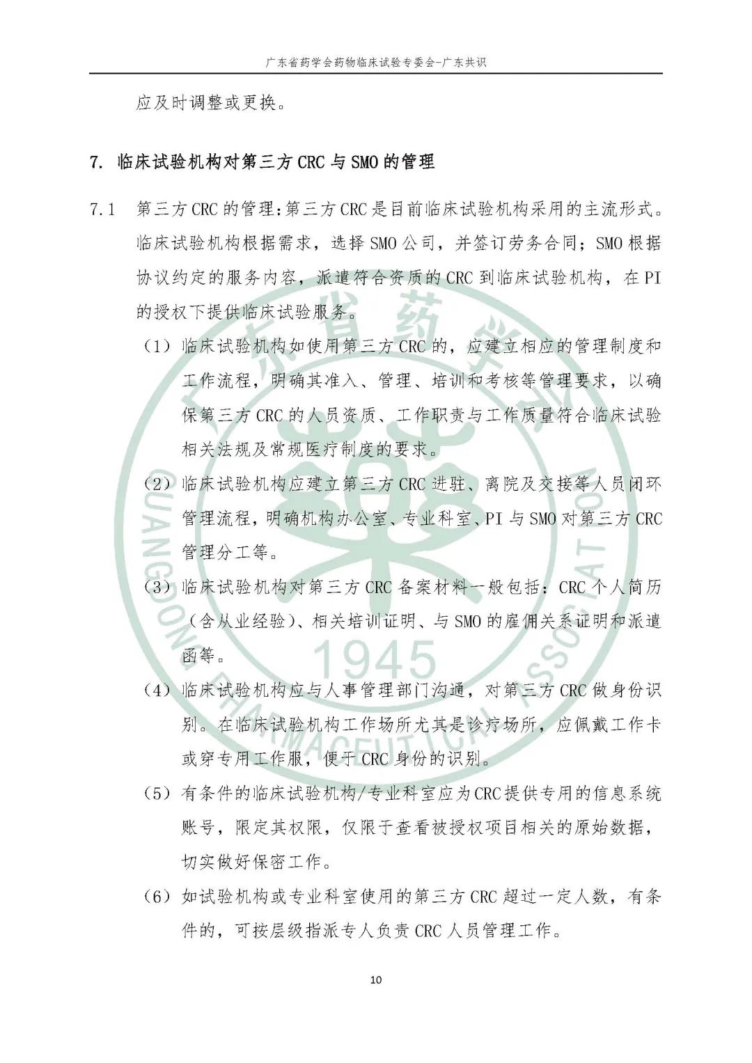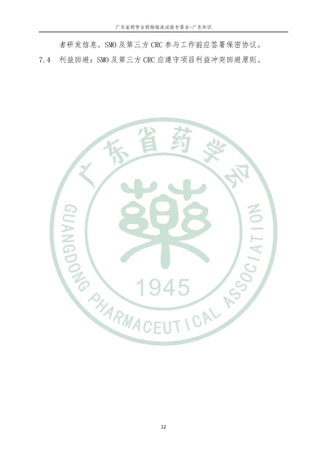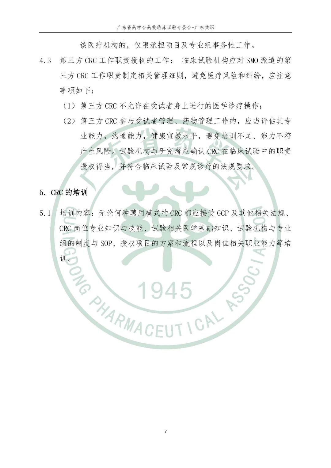 关于发布《药物临床试验 CRC管理广东共识 (2024年版)》的通知 粤药会〔2024〕92 号 发布时间:2024-07-30 各医疗机构: 临床研究协调员(Clinical Research Coordinator,CRC)作为研究团队一员,是临床试验实施过程的重要参与者。现行法律法规鲜见关于CRC的明确要求,行业内缺乏统一标准及质量控制。为规范CRC管理,广东省药学会药物临床试验专业委员会在2015年印发了《药物临床试验 CRC管理•广东共识(2014)》,并于2020年进行第一次更新。自2020年以来,CRC发展已形成行业规模,CRC的职责与任务在认识上已基本达成共识,但行业现状仍存在CRC资质参差不齐、各临床试验机构对SMO及CRC 的管理方式与要求各异、聘任方和使用方对CRC的培训与工作缺少监督、研究者对CRC职责认知不够等,这些都可能导至临床试验风险增加。广东省药学会药物临床试验专业委员会特组织专家团队对《药物临床试验 CRC管理•广东共识(2020年版)》进行了更新完善,现予以发布《药物临床试验 CRC管理·广东共识(2024年版)》,供各医疗机构参考。各医疗机构在执行过程中遇到与本共识相关的任何问题,请及时向本会反馈。 联系地址:广州市东风东路753号东塔7楼 广东省药学会 510080 联系电话:(020)37886326,37886321 传真:37886330 电子邮箱:gdsyxh45@126.com 网址:http://www.sinopharmacy.com.cn